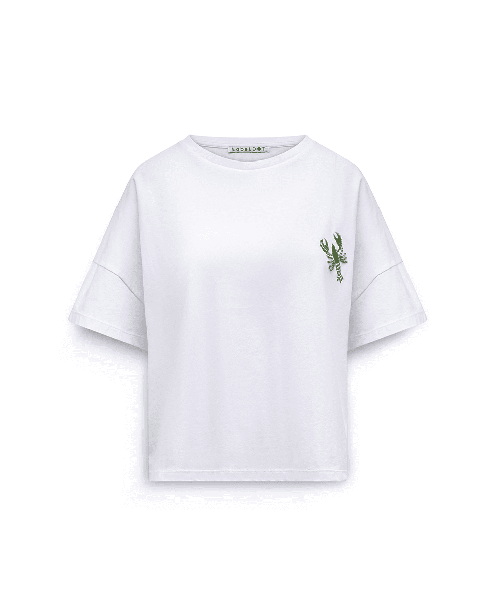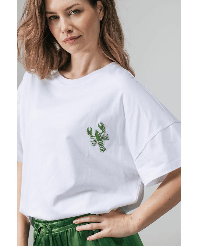 Een zomerse basic met een knipoog. T-shirt Mara heeft een boxy fit, verlaagde schouders en een geborduurde kreeft op de borst – subtiel versierd met kraaltjes voor een speels accent.