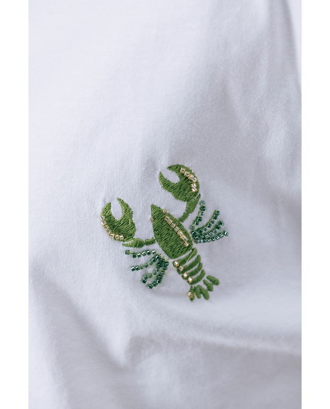 •Witte jersey met geborduurde kreeft en kraaltjes