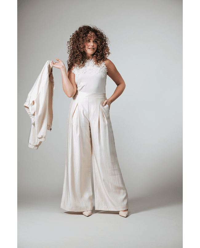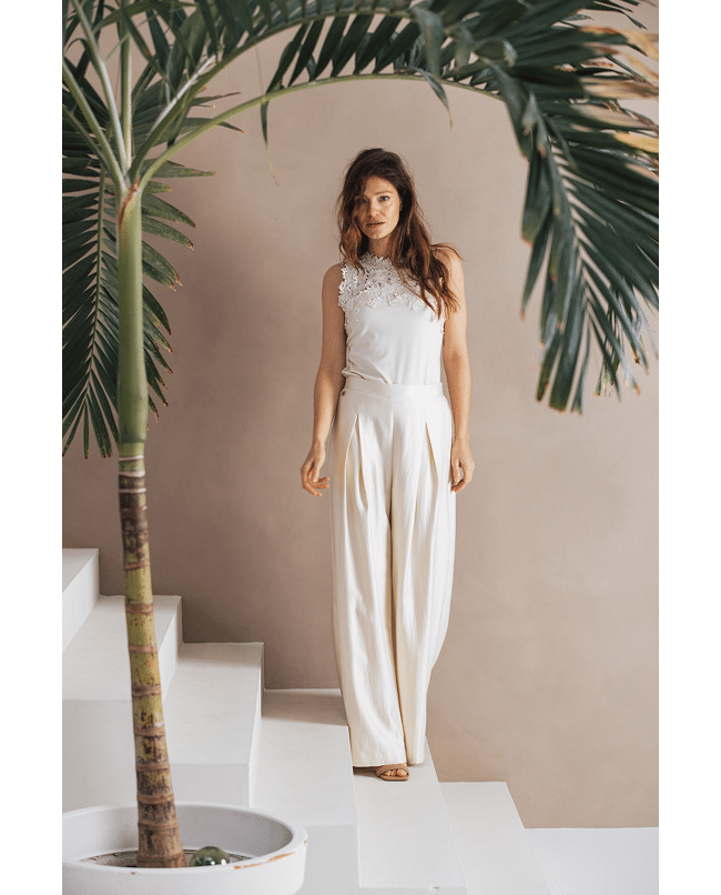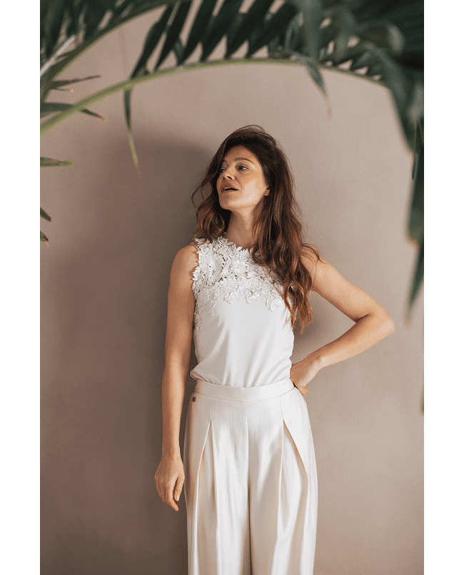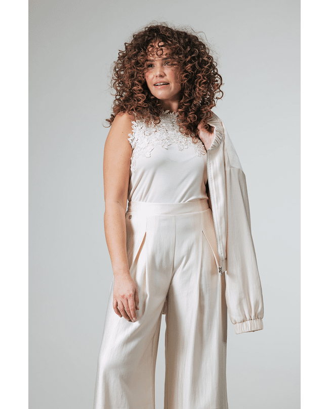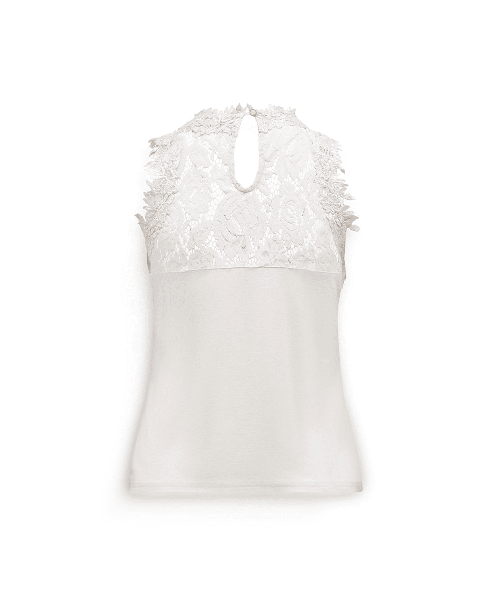 Deze elegante off white top is een verfijnde essential die je moeiteloos combineert. Het kanten bovenstuk geeft een vrouwelijke touch, terwijl de gladde stof zorgt voor comfort, de hele dag door. Perfect onder een blazer of solo op warmere dagen.
