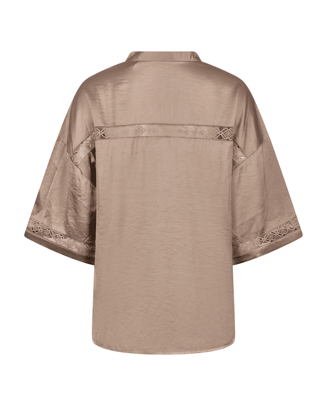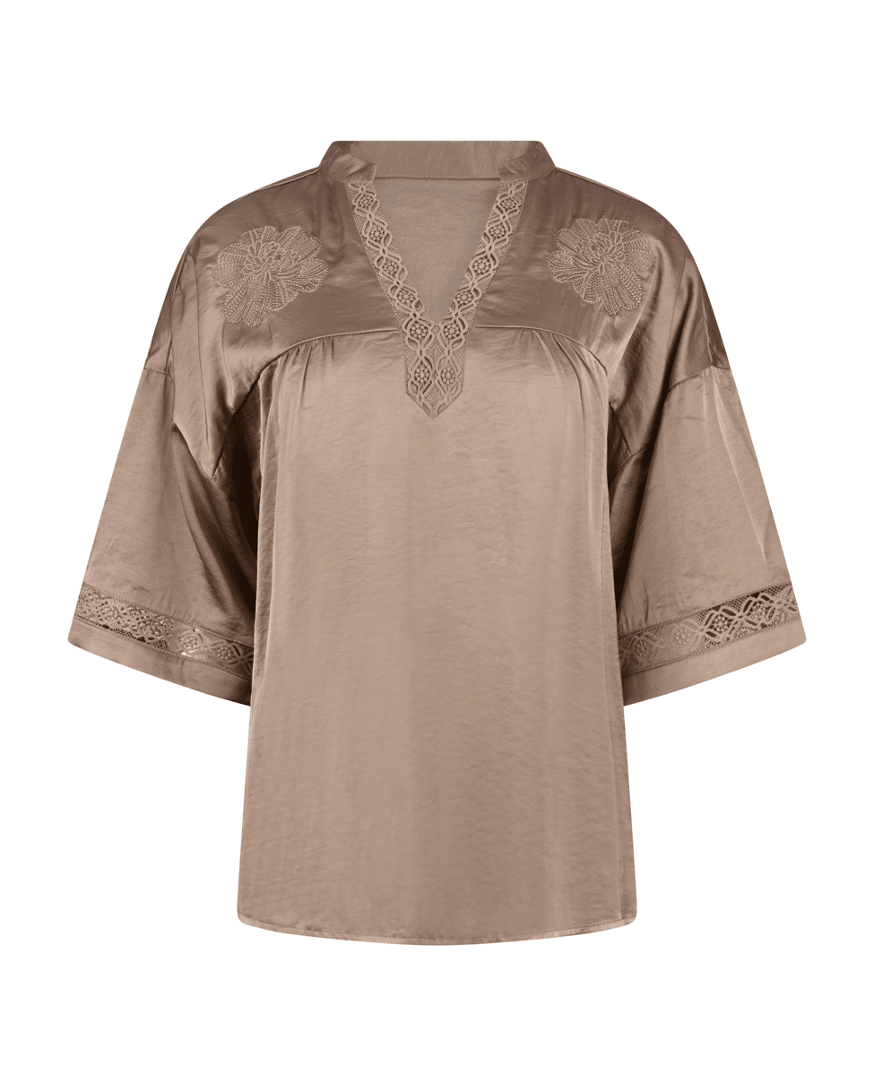 Deze zandkleurige dames top heeft een subtiele glans en verfijnde details die zorgen voor een rustige, vrouwelijke uitstraling. Mooi voor zowel een casual dag als een netter moment.