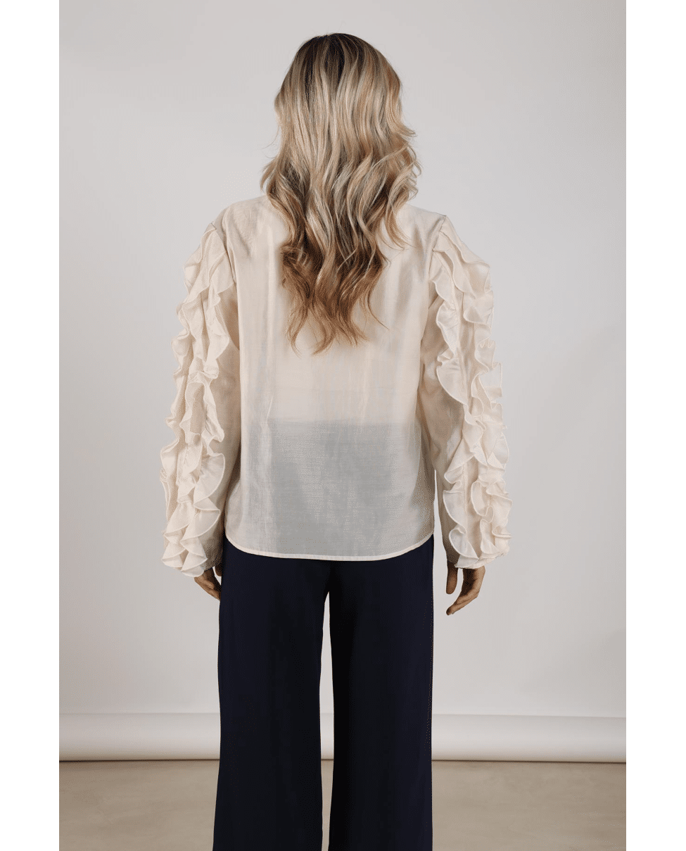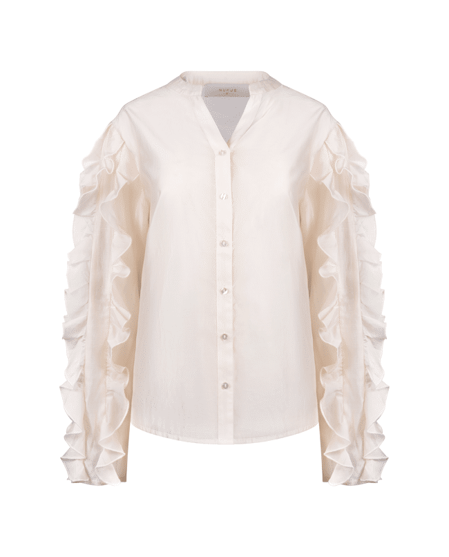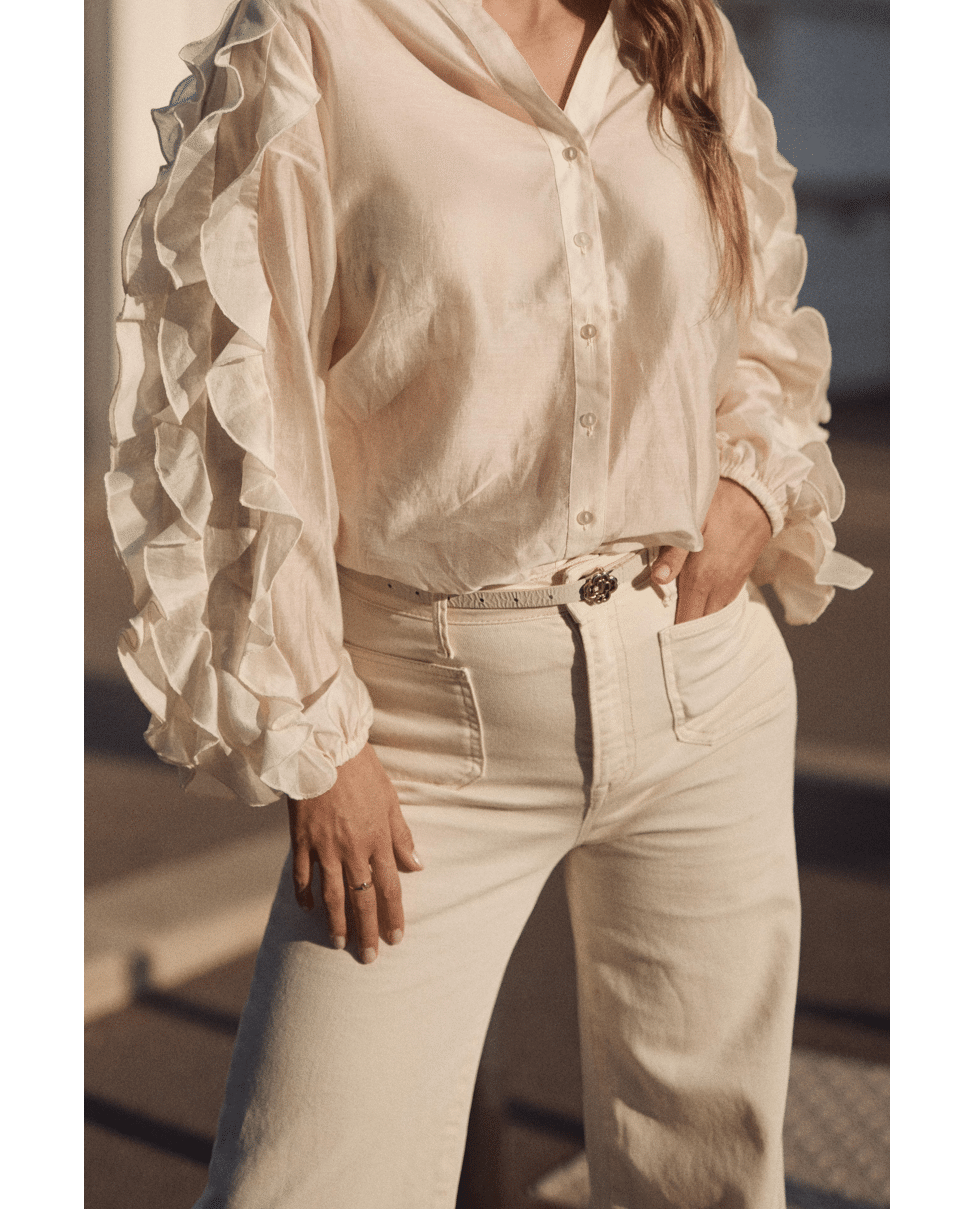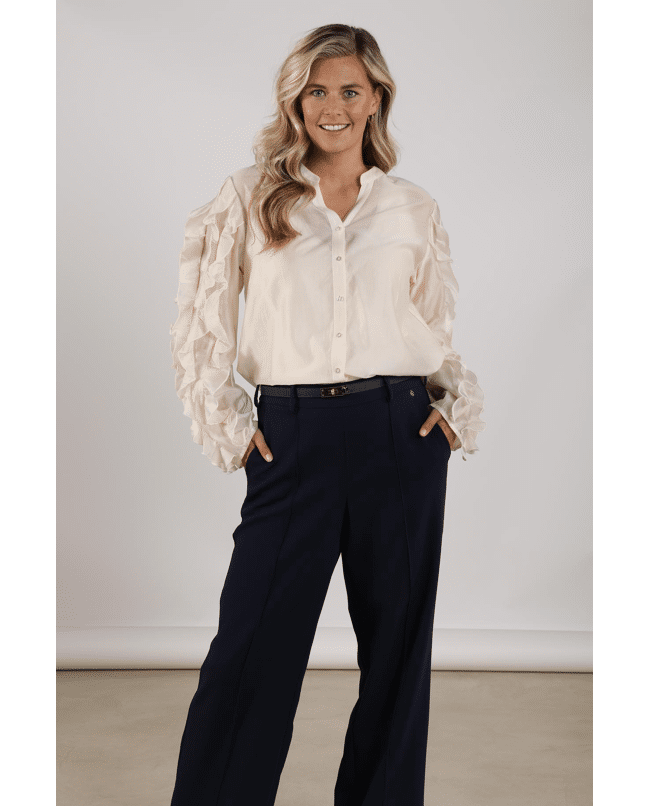 Een vrouwelijke blouse met flair: de Margriet blouse is licht en luchtig, met opvallende ruches langs de mouwen. Gemaakt in een offwhite tint die makkelijk combineert en ideaal is voor lente en zomer.