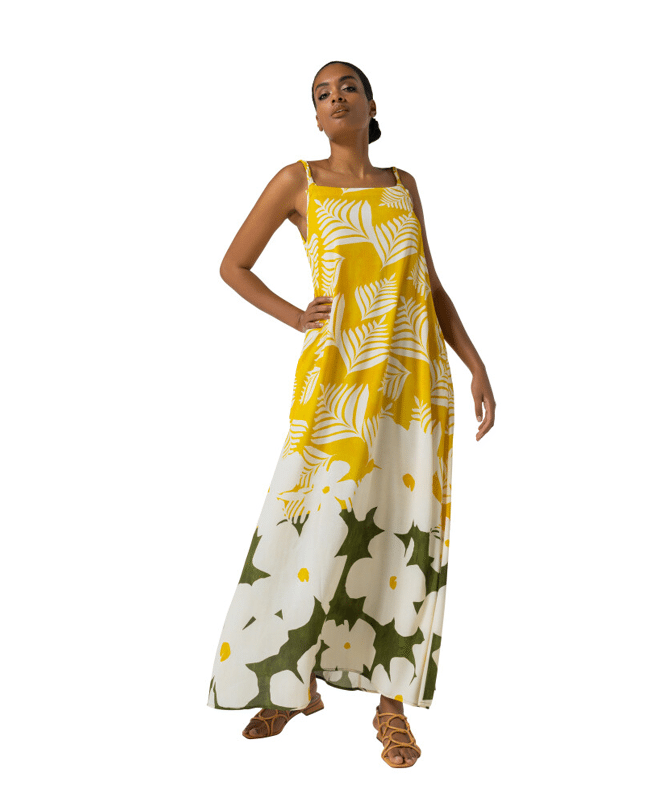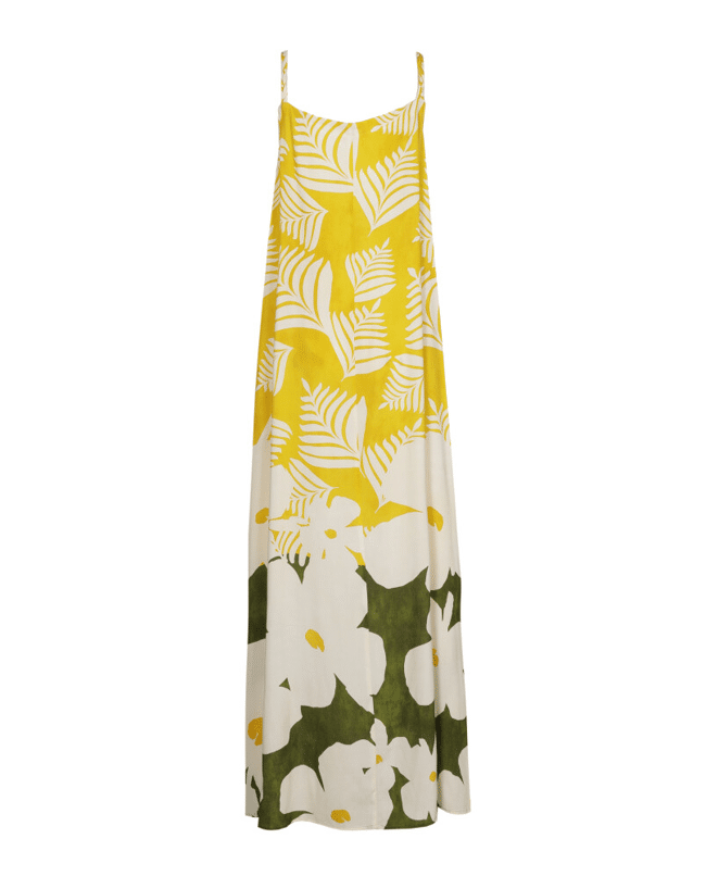 Een luchtige maxi-jurk met botanische print die meteen zomers aanvoelt. De soepele stof en lange lengte zorgen voor een ontspannen, vrouwelijke look – ideaal voor warme dagen.