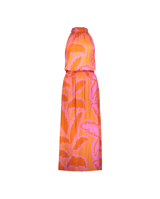 Deze halter maxi jurk in fuchsia en oranje is gemaakt voor zonnige dagen. De soepele viscose, open schouderlijn en gesmokte taille geven haar een vrouwelijke, luchtige uitstraling – perfect voor vakantie, een zomers feest of een diner op het terras.