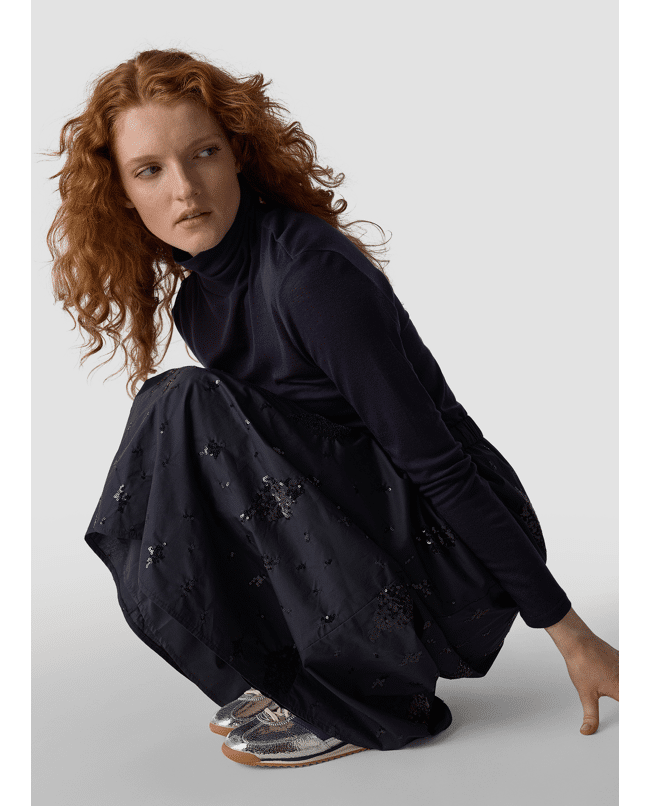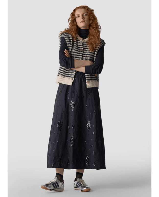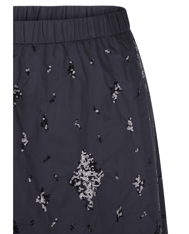 De subtiele glans van de pailletten geeft deze rok net dat beetje extra, zonder over the top te zijn. Stijlvol met een satijnen blouse of juist casual met een oversized trui.