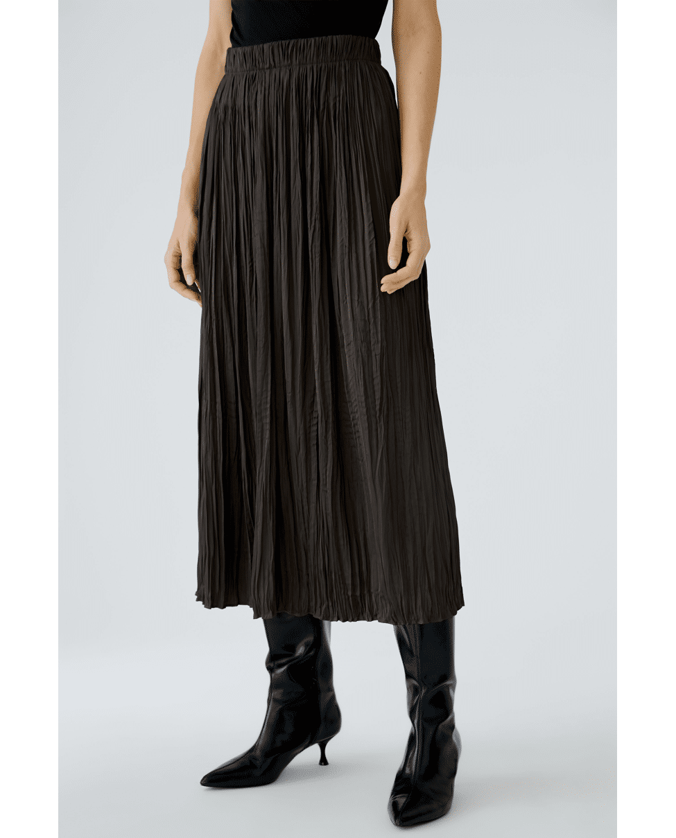 Een elegante maxi-rok in espresso bruin met subtiele glans. Het kreukeffect en de comfortabele tailleband maken dit item ideaal voor zowel casual looks als chique combinaties.