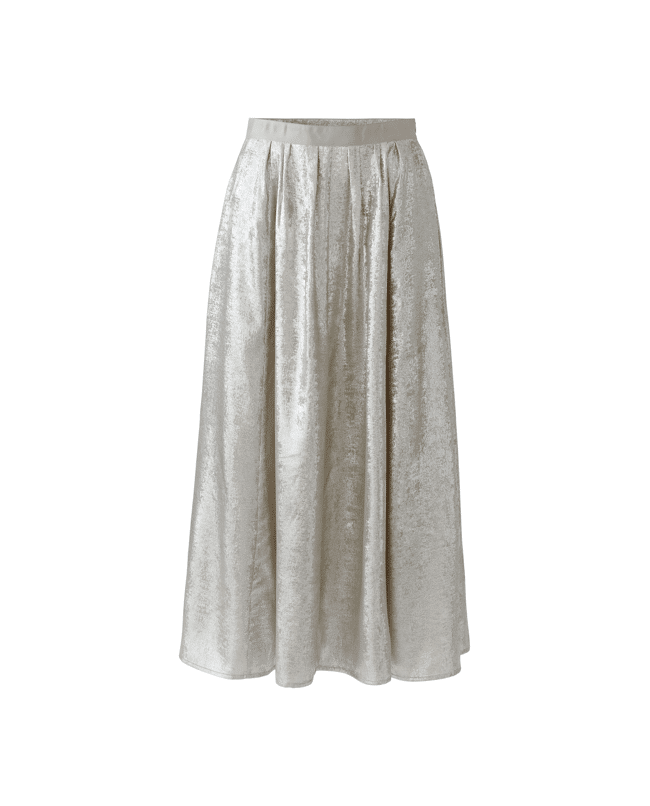 Een elegante maxirok met een subtiele metallic glans. De zilverkleurige stof geeft deze rok een moderne en verfijnde uitstraling die zowel chic als eigentijds oogt.