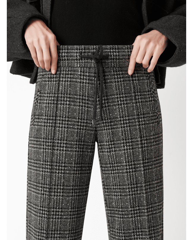 Soepelvallende jersey ontmoet een strakke ruit – zacht van vorm, scherp van vorm. Een elastische tailleband met strik combineert met strakke plooien en subtiele paspelzakken. Het silhouet: breed, maar toch gefocust.