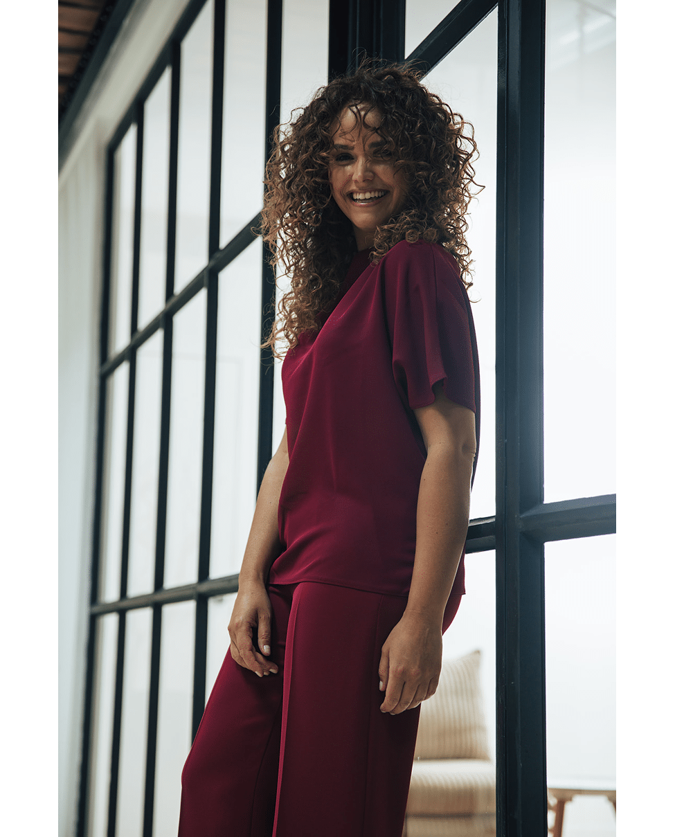Top met aangeknipte mouw Deze soepel vallende top met aangeknipte mouwen is gemaakt van dezelfde chique stof als onze pantalon Rana. Prachtig als set, maar ook stijlvol op een jeans. Een elegante essential die moeiteloos past bij zowel een casual als geklede look.