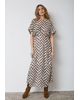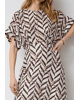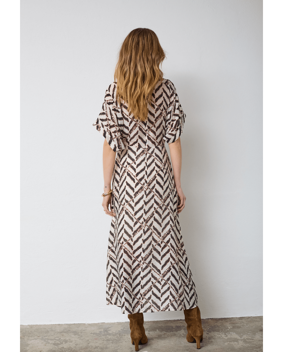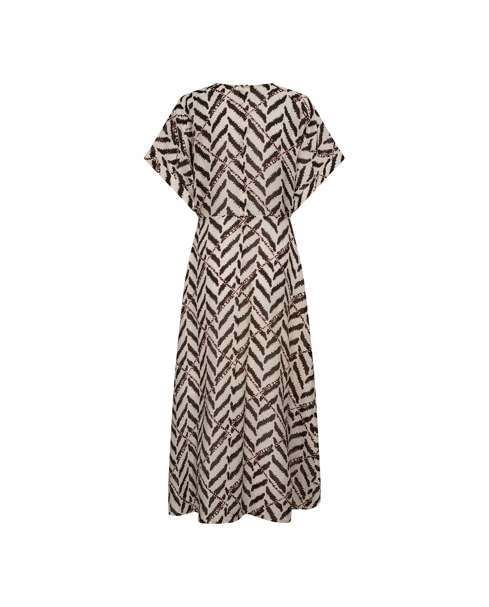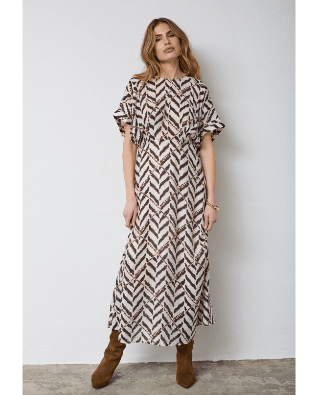 Een elegante maxi-jurk met een grafische print die direct opvalt. De soepele stof en losvallende pasvorm maken dit een fijne keuze voor zomerse dagen of een etentje op het terras.
