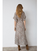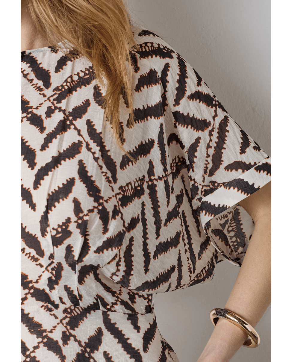 De kimonomouwen en het speelse patroon geven deze jurk een relaxte, maar stijlvolle uitstraling. Perfect voor vakanties of een dagje stad.