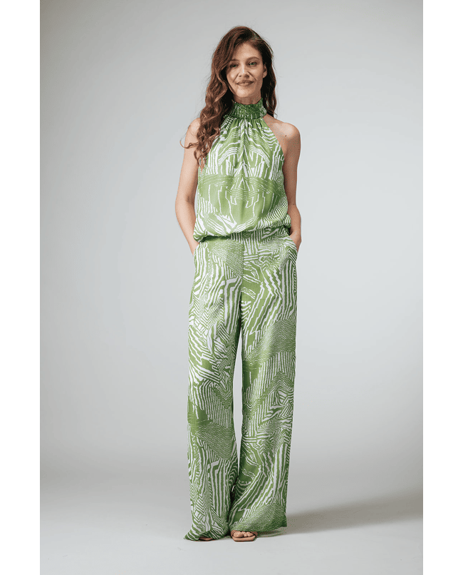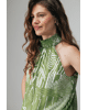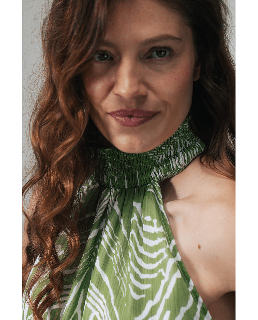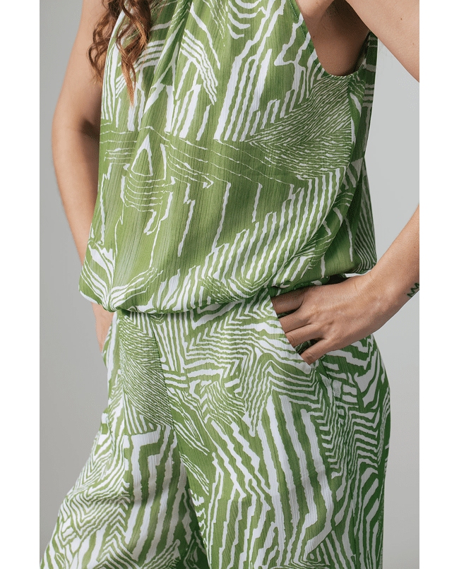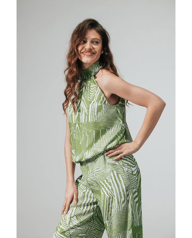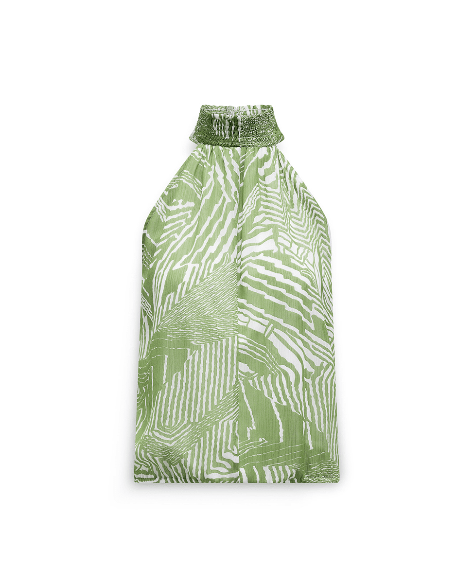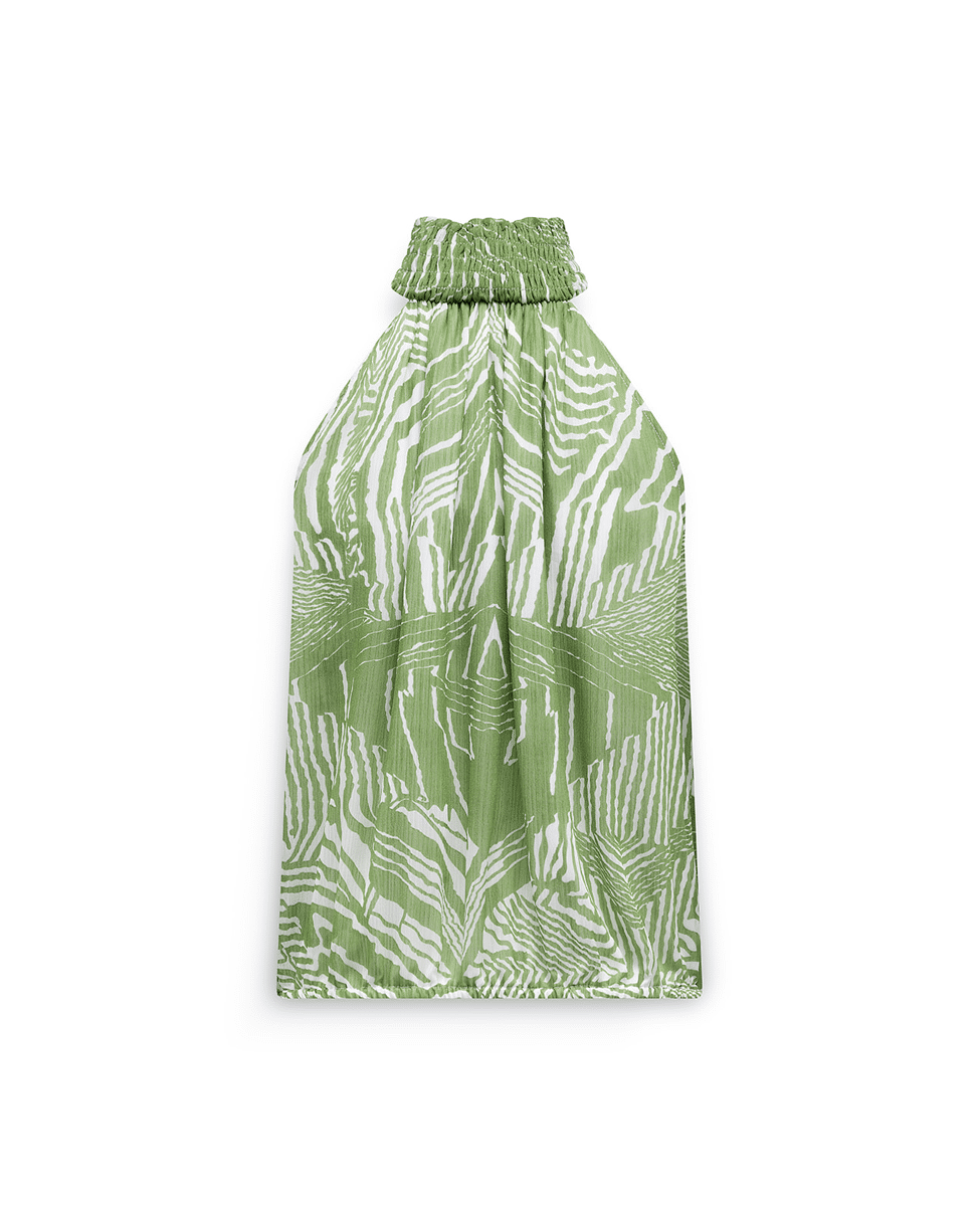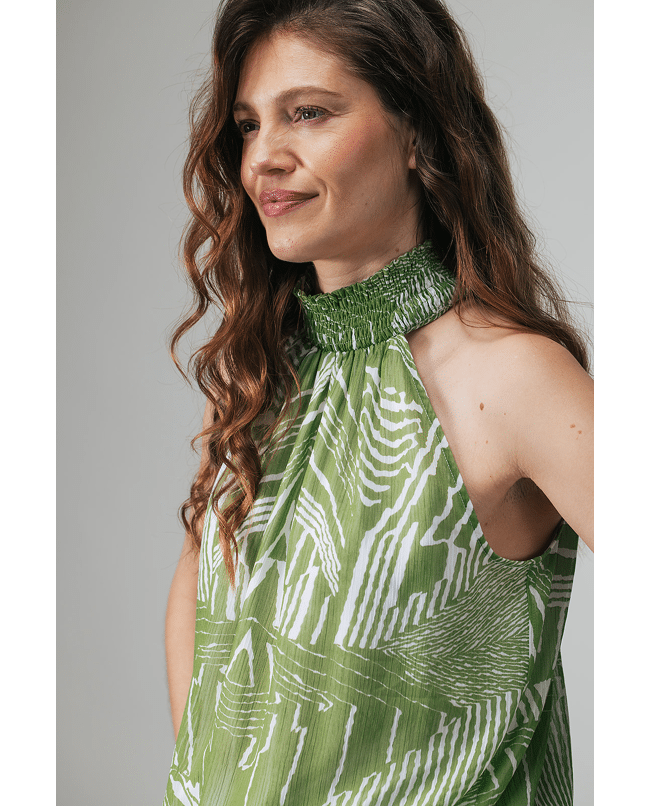 Deze groene top met grafische print is fris, zomers en lekker opvallend. De halterhals en luchtige stof maken ’m ideaal voor warme dagen, terwijl het dessin zorgt voor een moderne twist.
