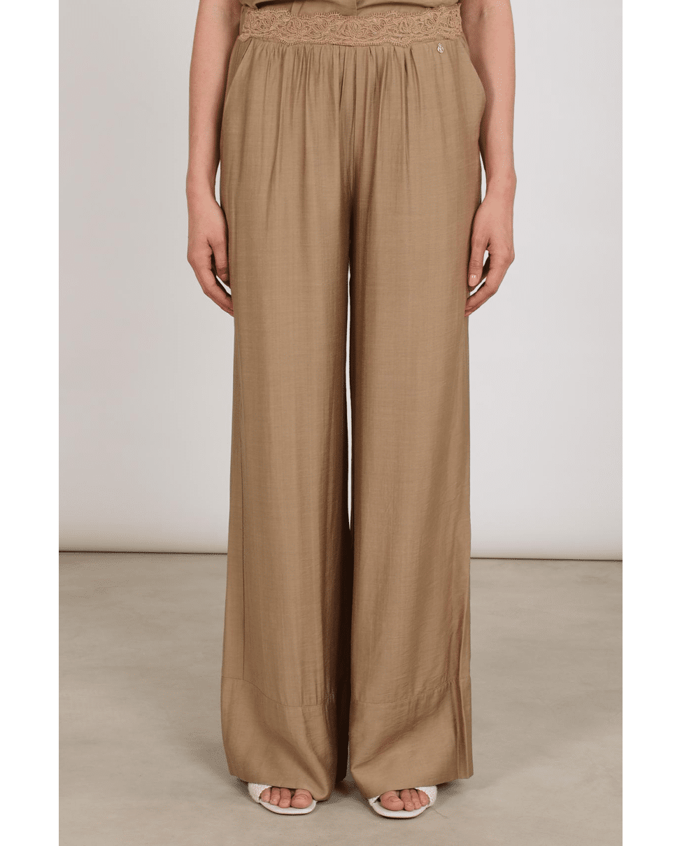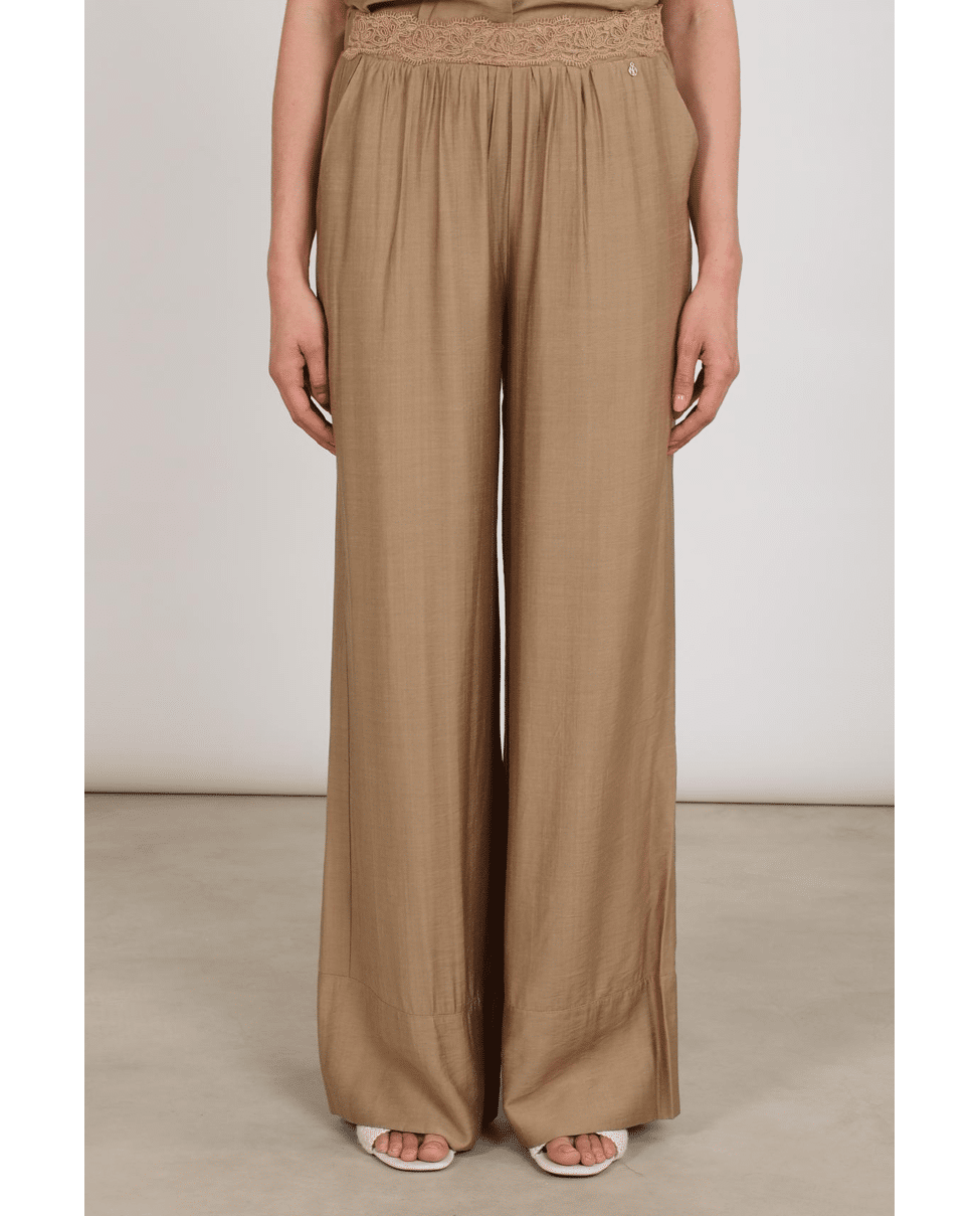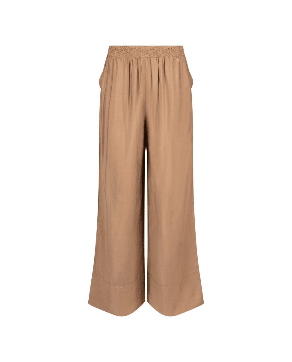 Een soepel vallende dames broek in warme camel tint met een verfijnde kanten tailleband. De wijde pijpen geven een elegante, luchtige look – perfect voor zomerse dagen of een ontspannen, stijlvolle outfit.