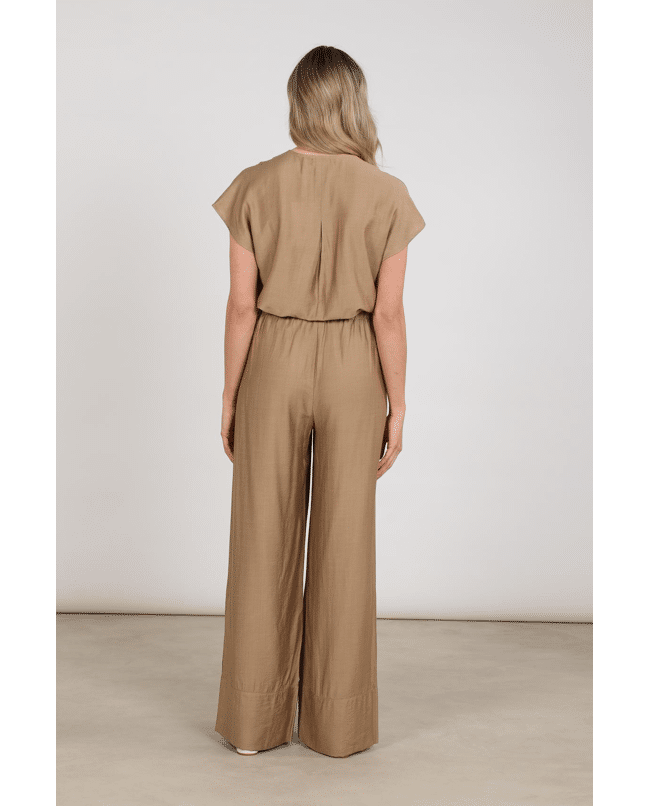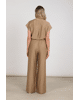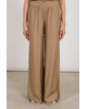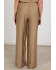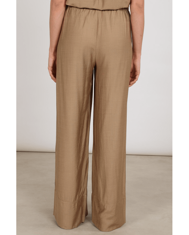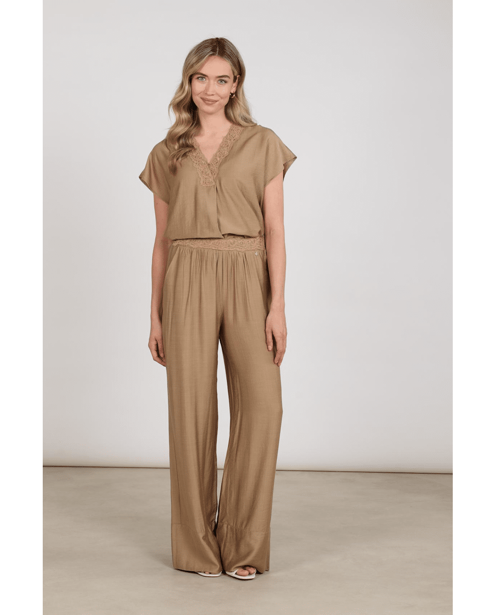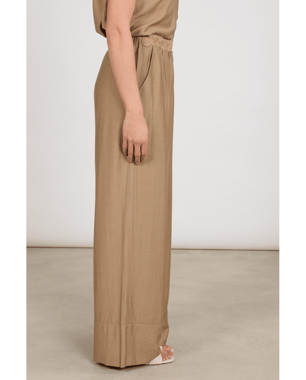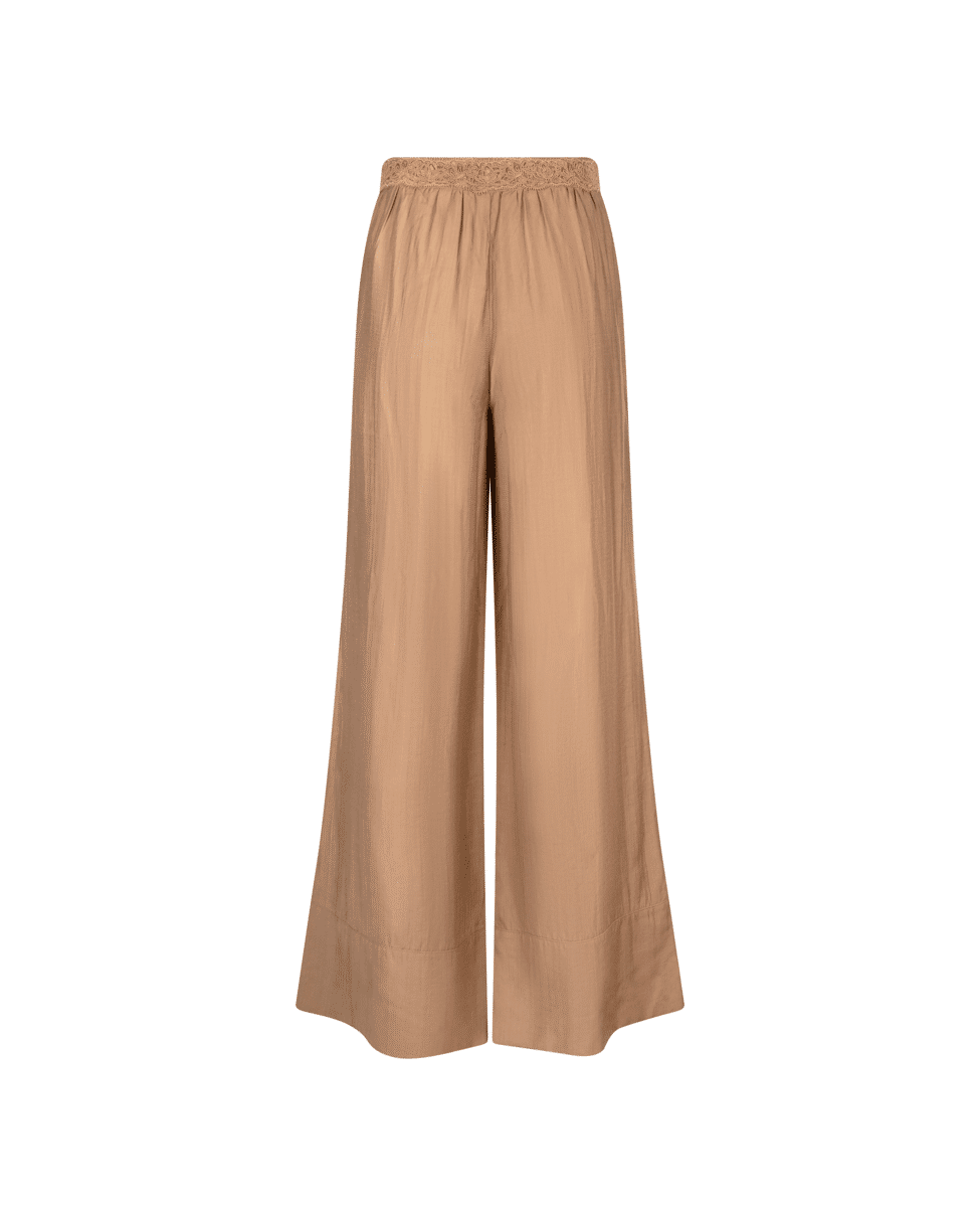 Een soepel vallende dames broek in warme camel tint met een verfijnde kanten tailleband. De wijde pijpen geven een elegante, luchtige look – perfect voor zomerse dagen of een ontspannen, stijlvolle outfit.