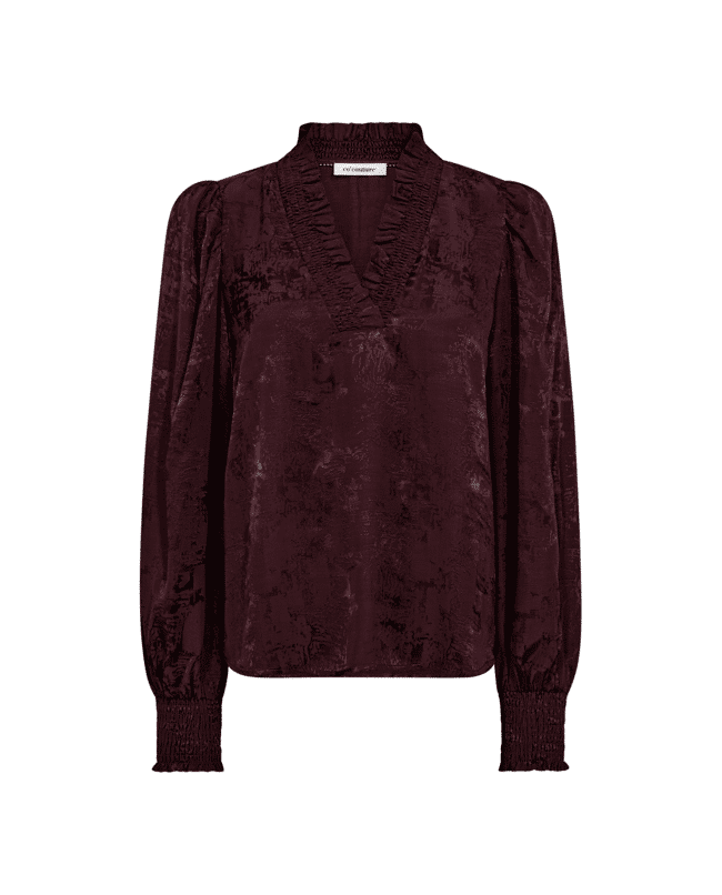 Deze feestelijke blousetop is een verfijnde damestop in een diepe bordeauxkleur. Met zijn elegante V-hals, vrouwelijke details en luchtige pasvorm is dit een tijdloze keuze voor werk, diner of weekend.