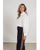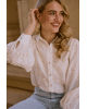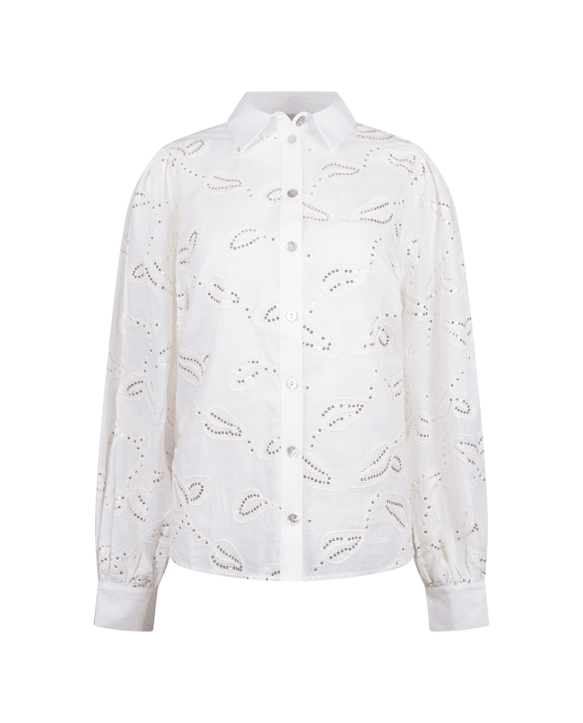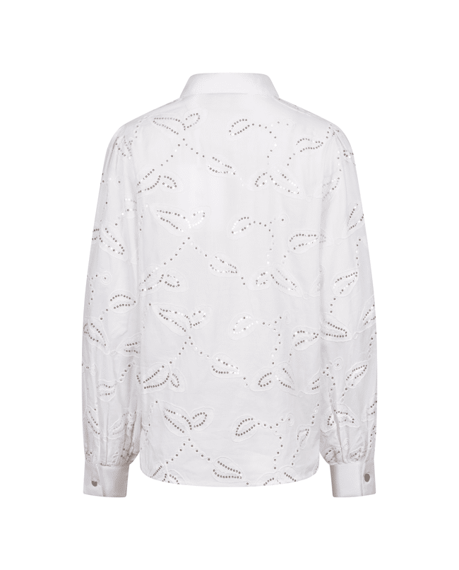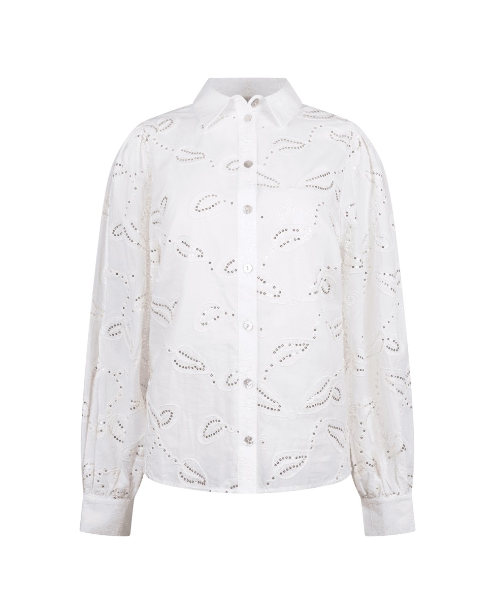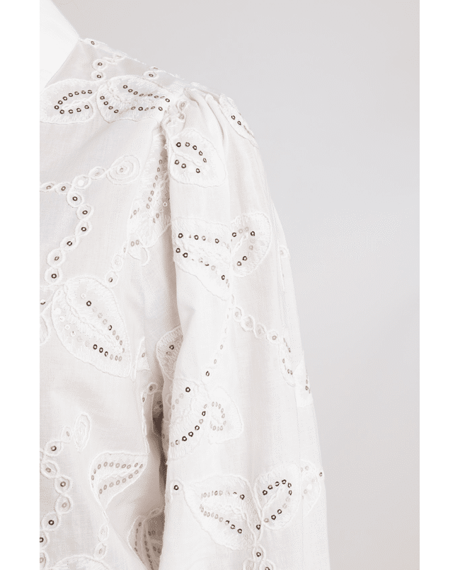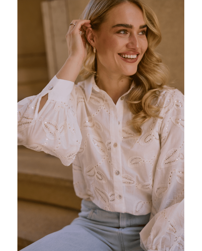 Luchtig, elegant en met een subtiele glans. Deze off-white damesblouse is versierd met verfijnd borduurwerk en glinsterende pailletten. Perfect voor zonnige dagen, feestelijke momenten of gewoon als stijlvolle blikvanger.