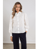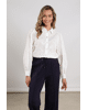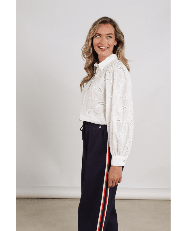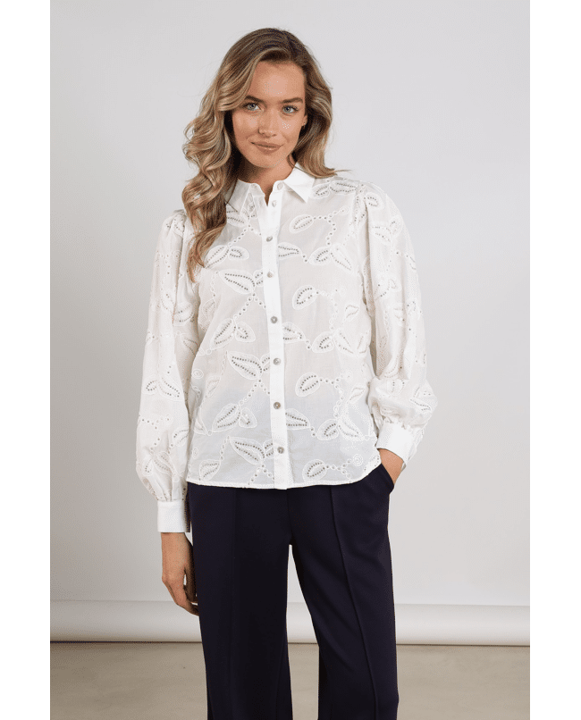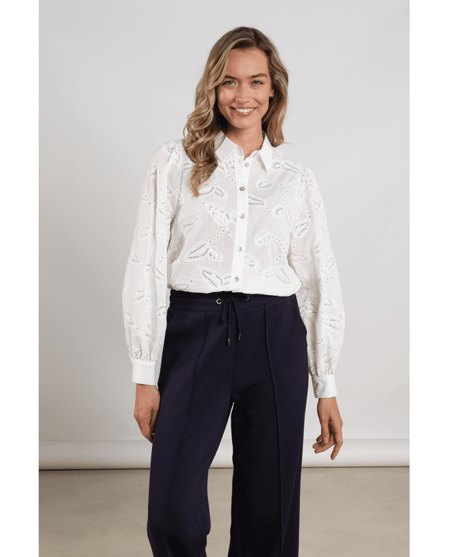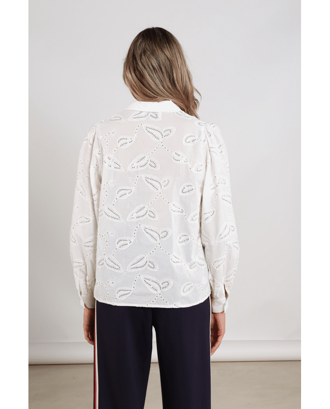 De klassieke kraag en doorknoopsluiting zorgen voor een tijdloze basis, terwijl het borduurwerk een vrouwelijke twist geeft.