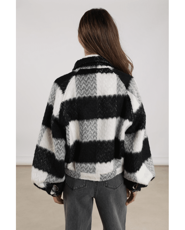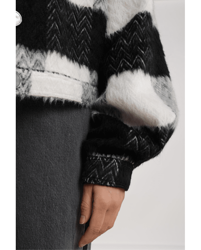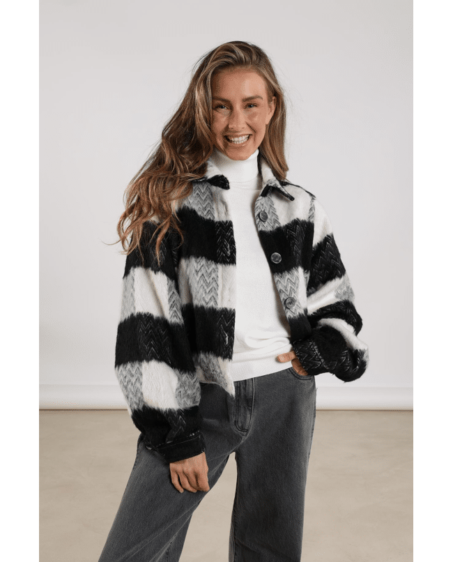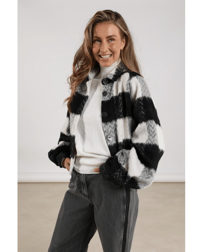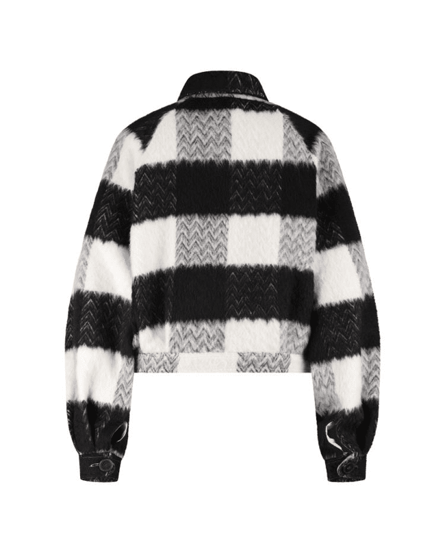 De zwart-witte contrastdetails geven deze jas een moderne edge – makkelijk te combineren en altijd opvallend.