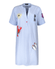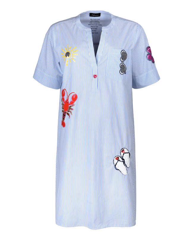 Dit is een korte damesjurk met fijne streep en speelse patches van Grace. De lichtblauwe streepprint en zomerse applicaties geven de jurk een frisse en casual uitstraling. Ideaal voor warme dagen, een citytrip of een ontspannen vakantie look.