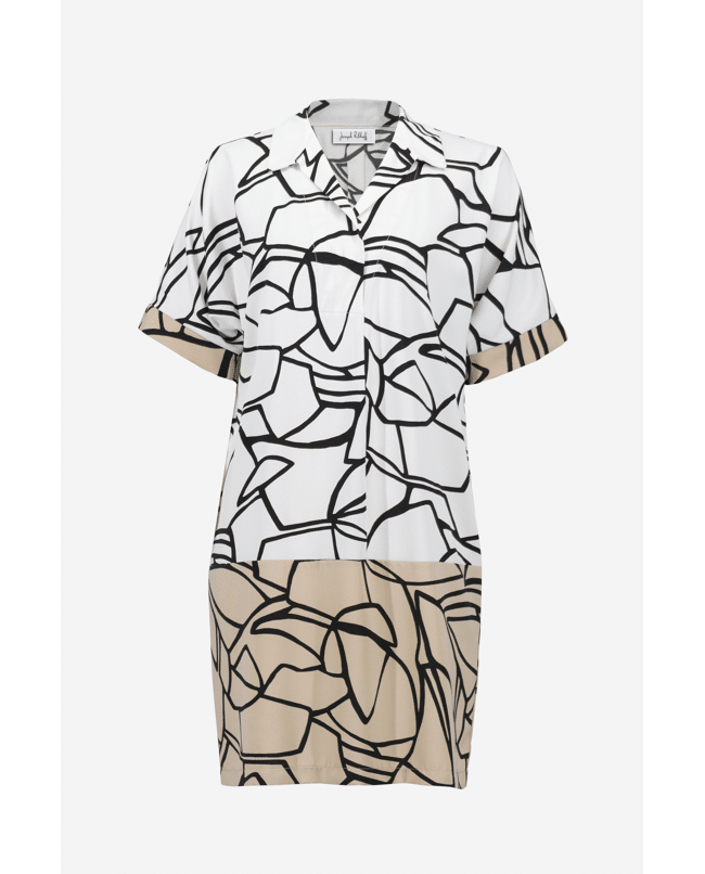 Opvallend en luchtig – perfect voor een stijlvolle zomerdag. Deze overhemdjurk van gerecycled materiaal valt soepel om het lichaam en heeft een opvallende abstracte print. De rechte pasvorm en grafische zoom geven een moderne twist aan een tijdloze klassieker. Een opvallende contrasterende zoomband zorgt voor een grafische afwerking.