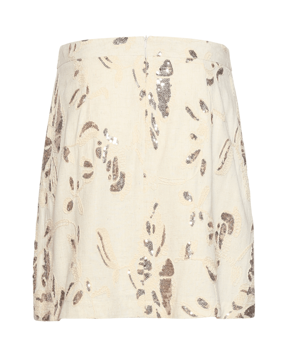 Een verfijnde A-lijn rok met glinsterend borduurwerk. Deze rok brengt subtiele glamour in een luchtige zomerse look. Perfect voor feestelijke gelegenheden of een elegante lunch in de zon.
