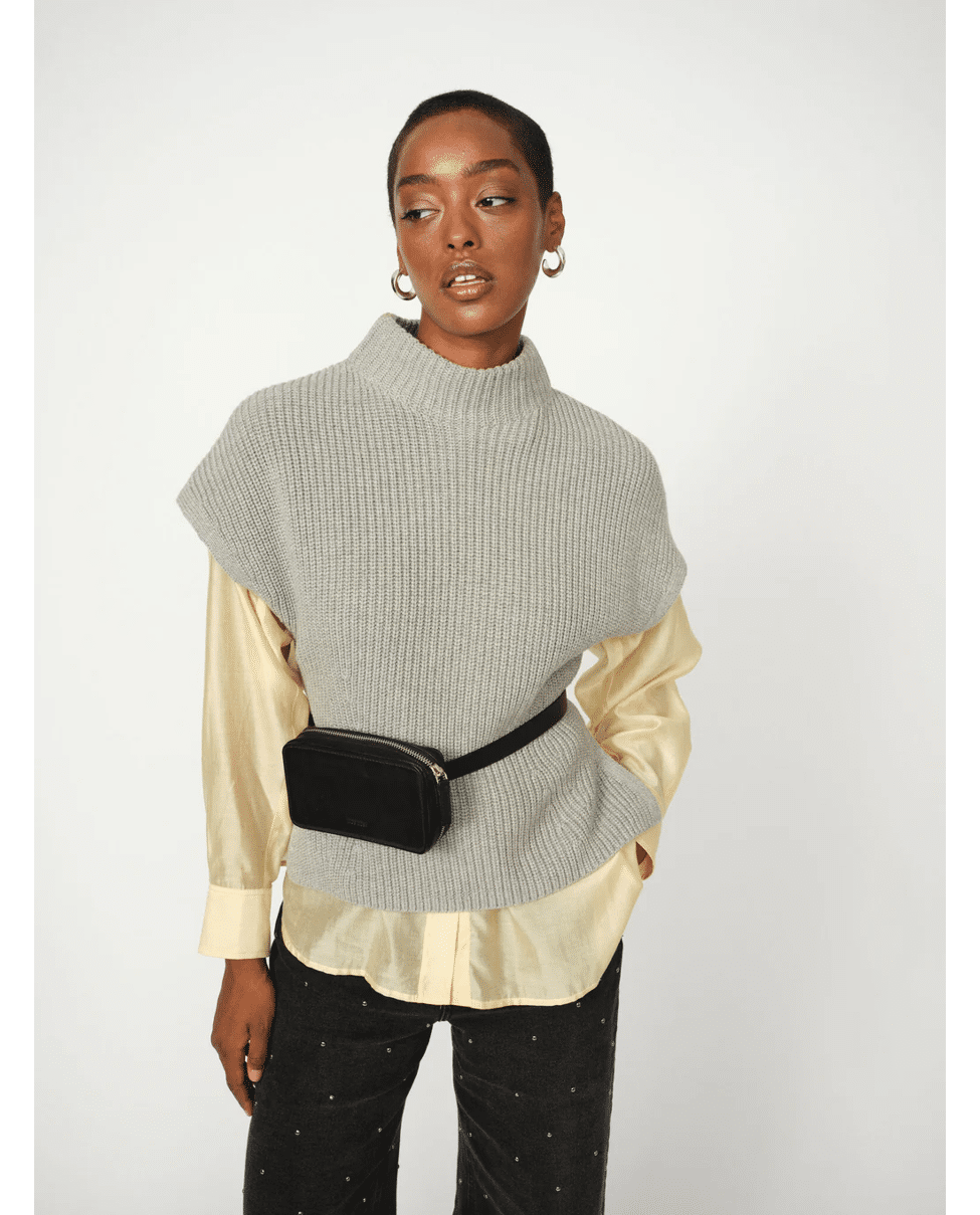 Deze gemêleerde trui heeft een verfijnde, getailleerde pasvorm en een hoge hals. Ideaal voor laagjes in het tussenseizoen of als chic accent in je look.