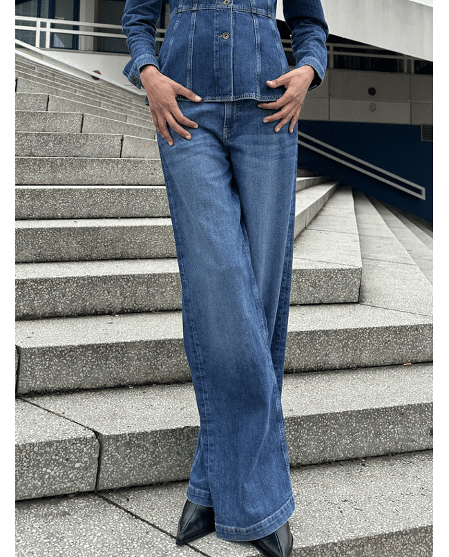 •Uitlopende pijpen met hoge taille en sierdetails op de zakken