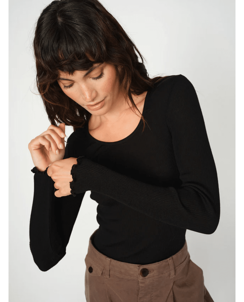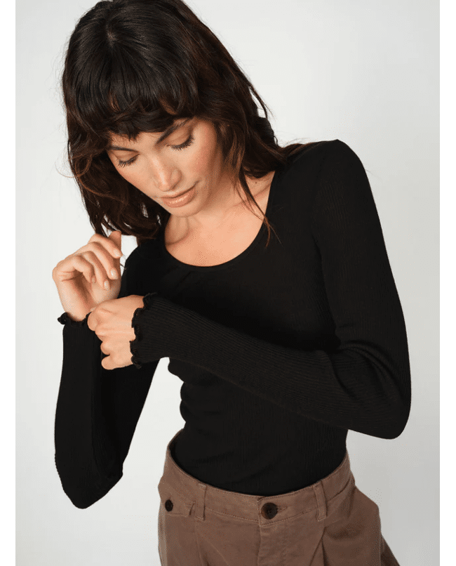 Dit naadloze, geribde T-shirt is een comfortabele essential met een vrouwelijke twist. De geplooide zomen en manchetten geven het een subtiel speels detail. Perfect als zachte basic onder een blazer of los op denim.