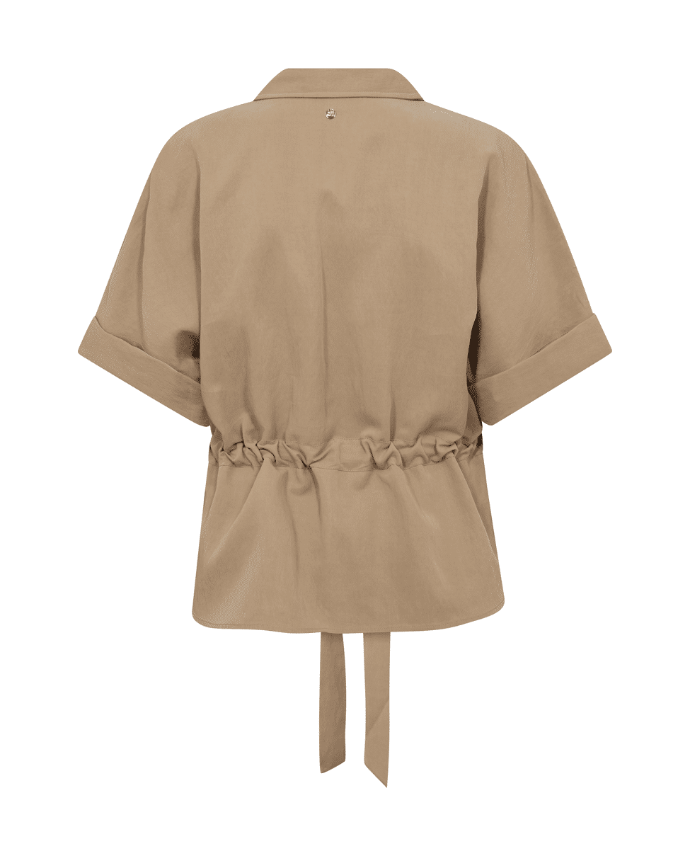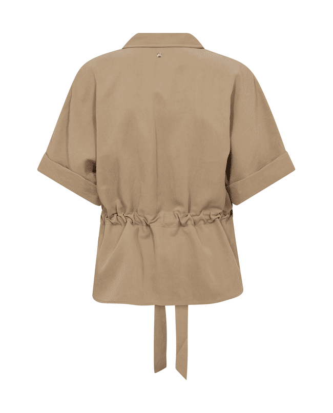 Een luchtige blouse met korte mouwen, ritssluiting en strikceintuur – perfect voor zomerse dagen waarop je er stijlvol en comfortabel uit wilt zien.