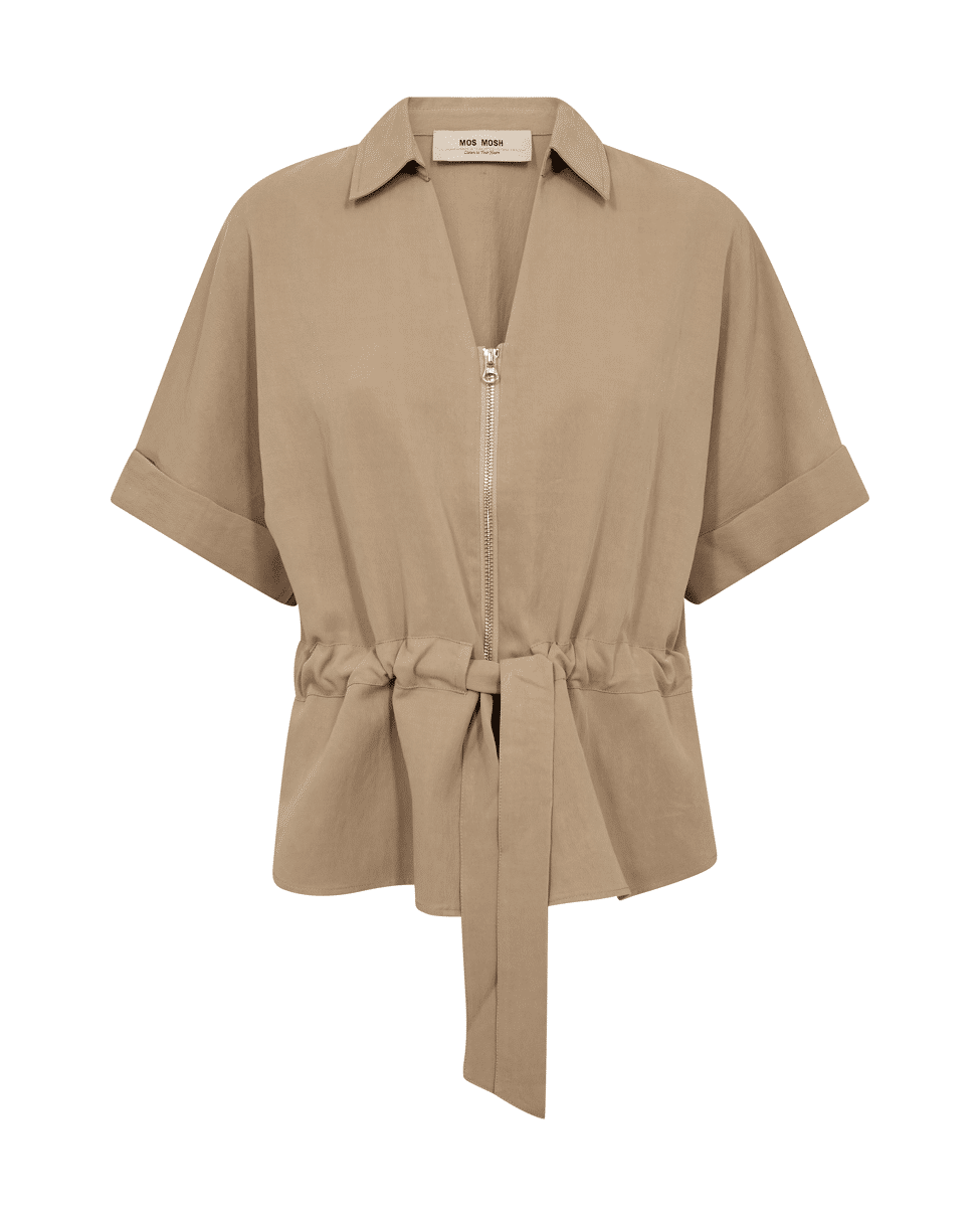 MMIndie Gunilla – Dames blouse van Mos Mosh met ritssluiting, striklint in de taille, kraag met V-hals en korte mouwen