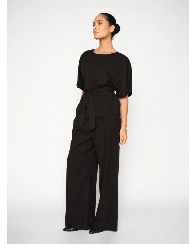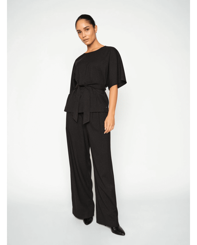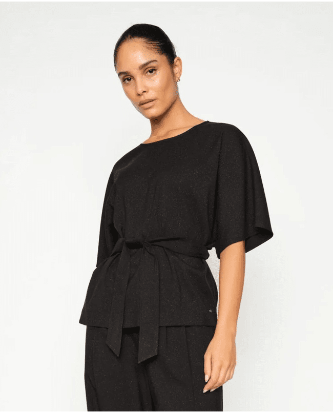 Deze blouse heeft een subtiele glans en wordt getailleerd met een brede ceintuur. Perfect voor feestelijke diners of een avond uit.