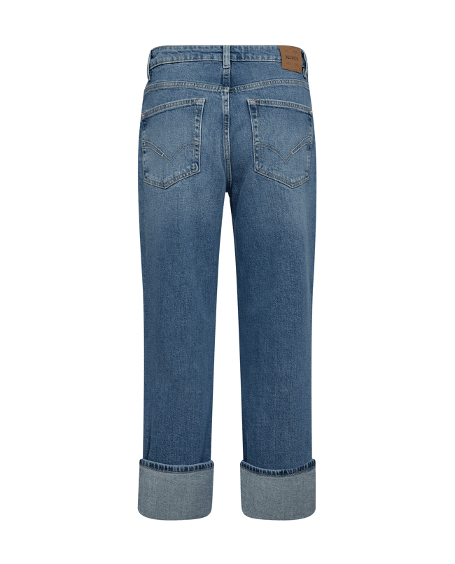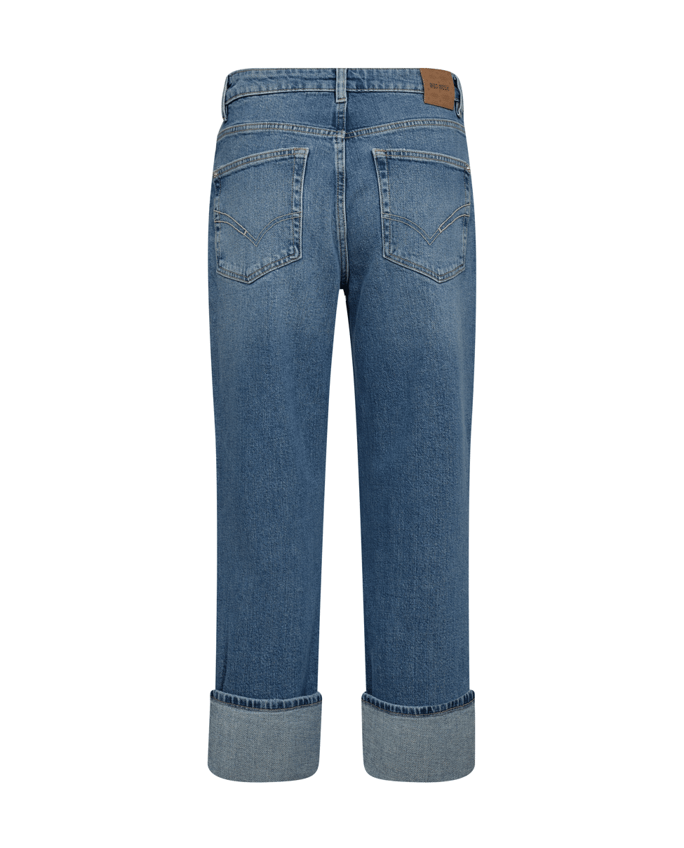 Boyfriend fit. Zit losser op heup en dij, met omgeslagen zoom.