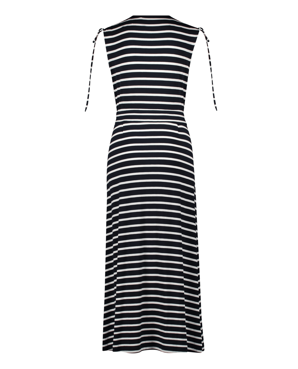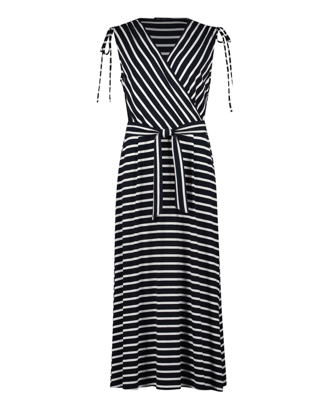 Deze mouwloze jurk van zachte jersey heeft een flatterende V-hals, strikceintuur en een speels streepdessin. Perfect voor zomerse dagen of vakanties aan zee.