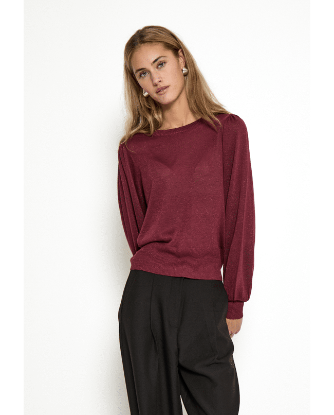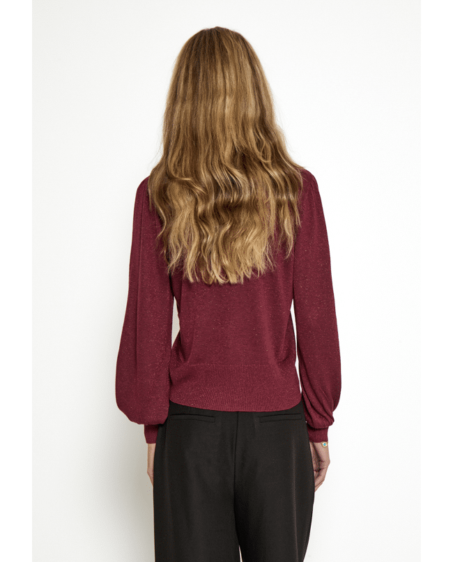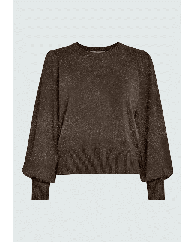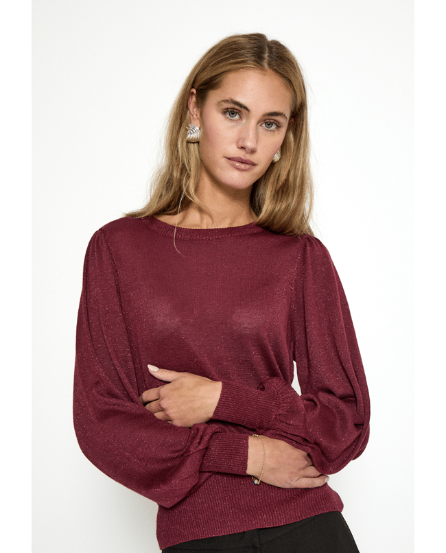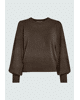 MSLiva Metall – Gebreide damestrui van Minus met metallic glans, ronde hals en lange pofmouwen