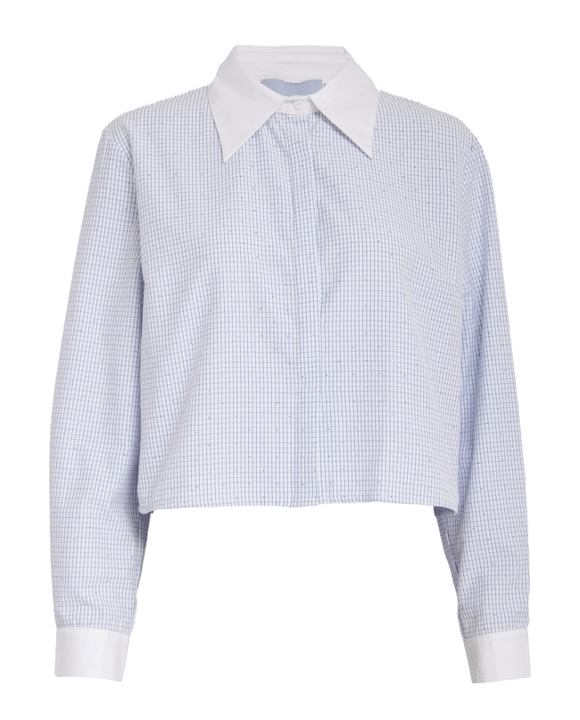 Preppy met een sprankelende twist. Deze korte blouse combineert een klassieke ruit met subtiele strassteentjes en een contrasterende witte kraag. Perfect voor wie houdt van details met een knipoog.