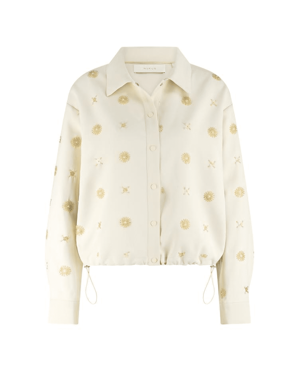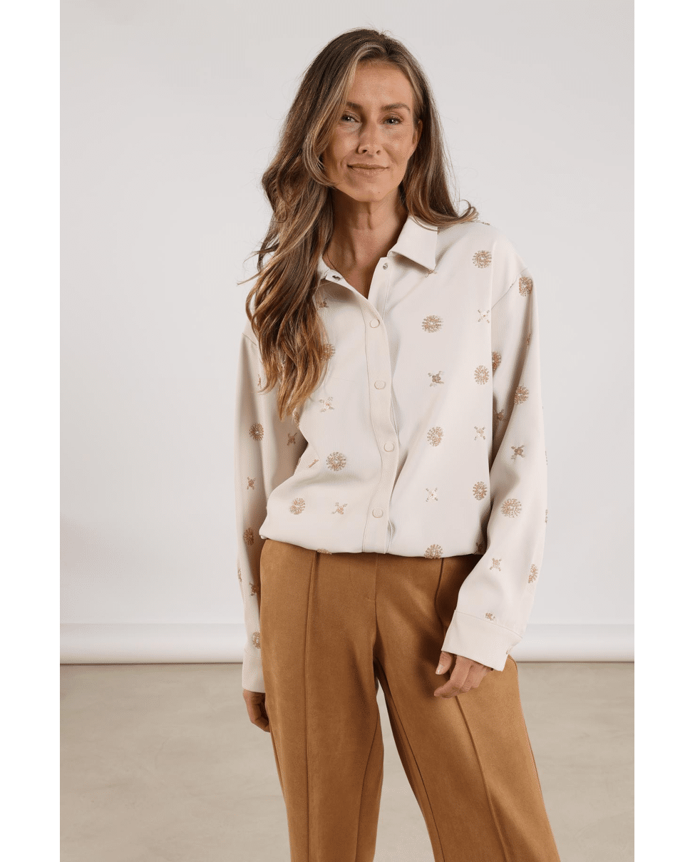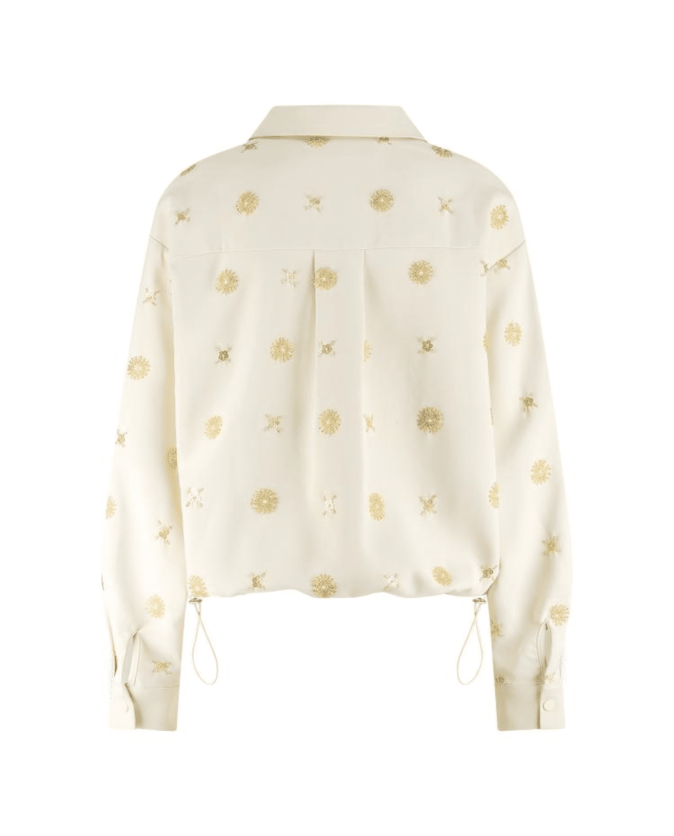 Deze offwhite blouse met goudkleurig borduurwerk straalt subtiele elegantie uit. Ideaal voor bijzondere momenten of om je dagelijkse look te laten schitteren.