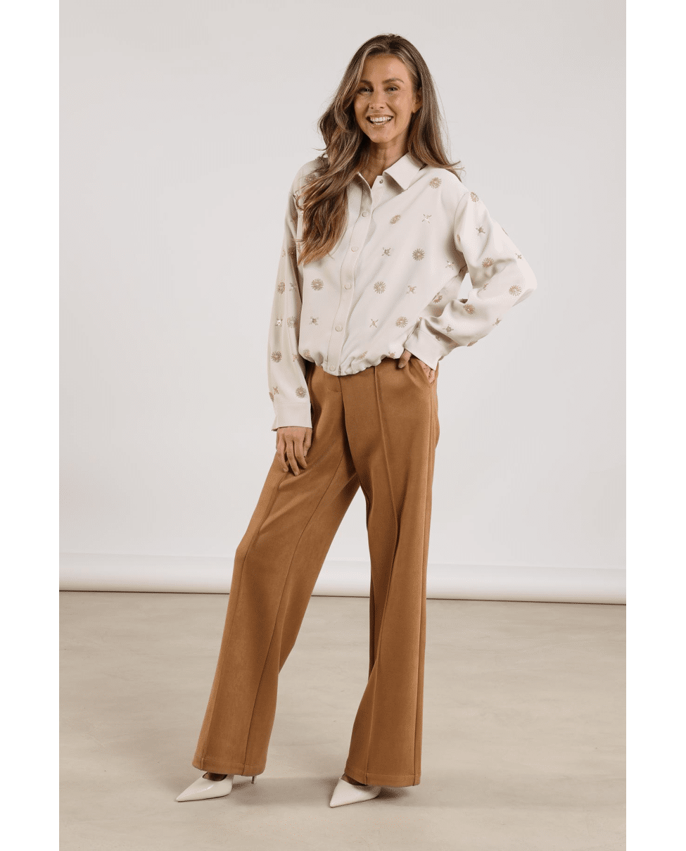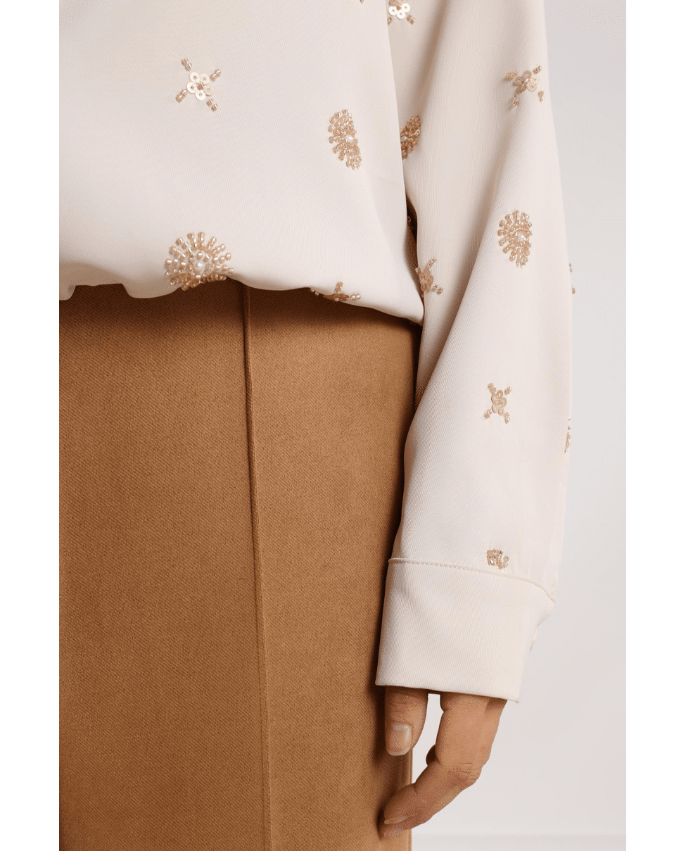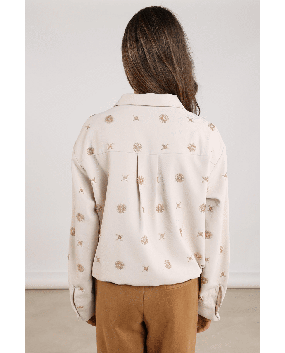 Deze offwhite blouse met goudkleurig borduurwerk straalt subtiele elegantie uit. Ideaal voor bijzondere momenten of om je dagelijkse look te laten schitteren.