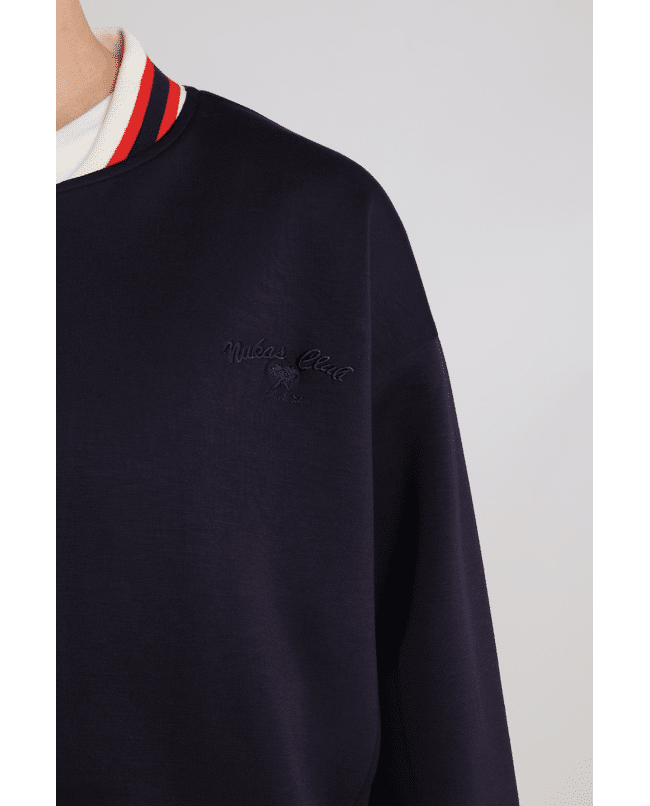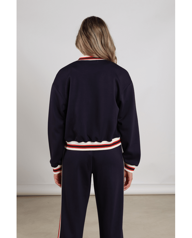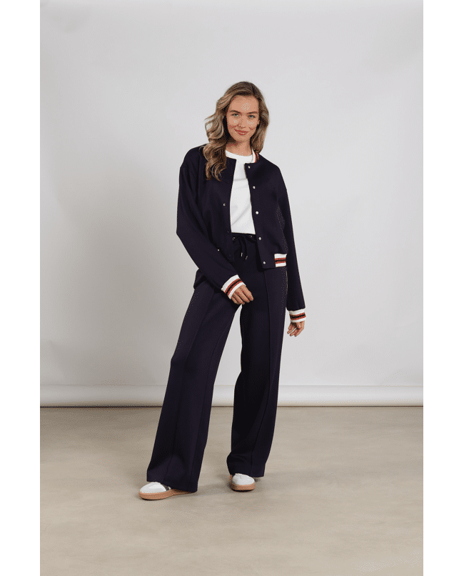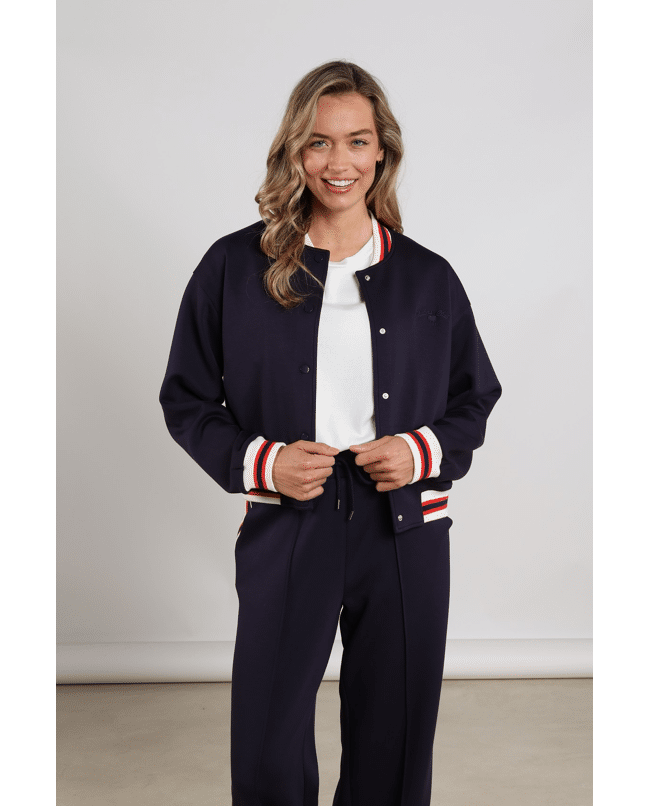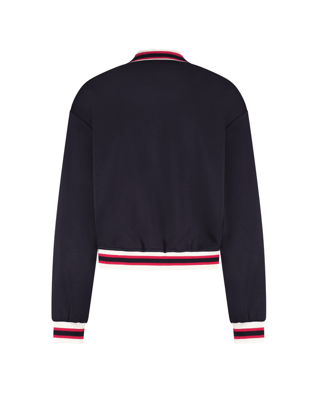 De Nina Jacket in navy heeft een tijdloos bombermodel met contrasterende boorden. Combineer met denim, sneakers of juist vrouwelijker met een jurk.