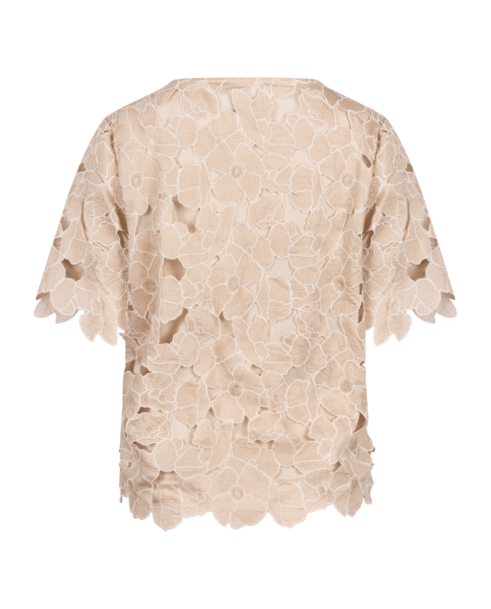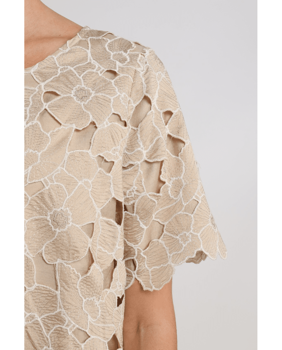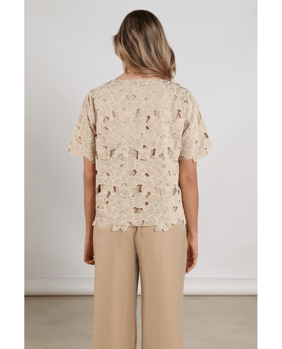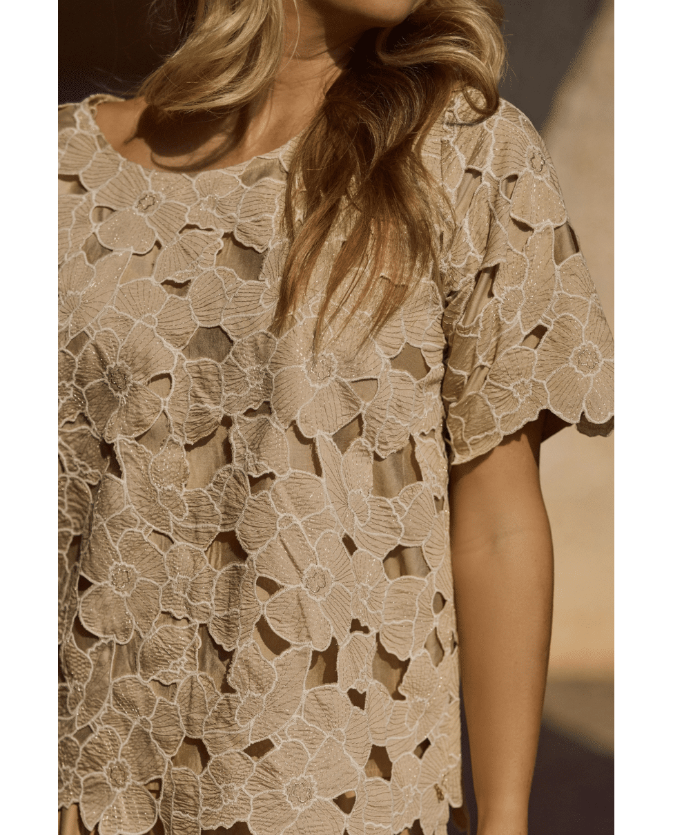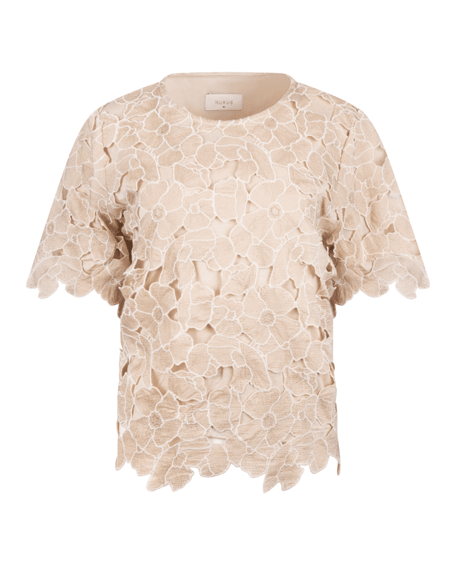 De Octavia Top Flower van NUKUS is een zandkleurige dames top met verfijnde bloemenapplicatie in sand en goudtint. Deze elegante flower top geeft je lente- en zomerlook een zachte, vrouwelijke uitstraling.