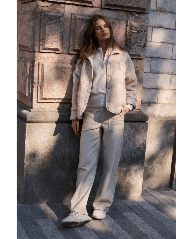 Twee jassen in één: deze reversible teddy jacket combineert zachte teddy met gladde nylon details. Perfect voor frisse ochtenden, stadse wandelingen of als licht jasje in het voorjaar.