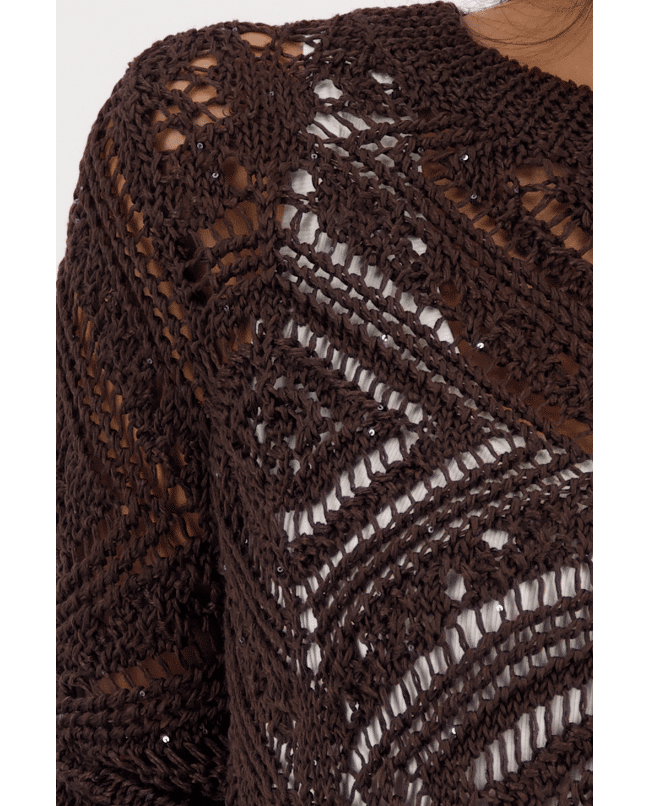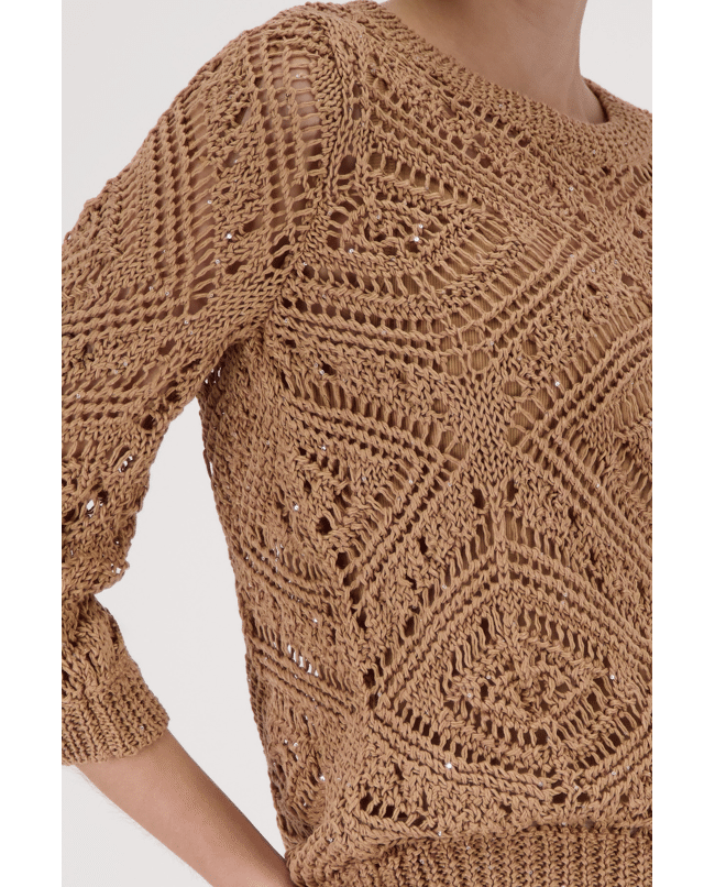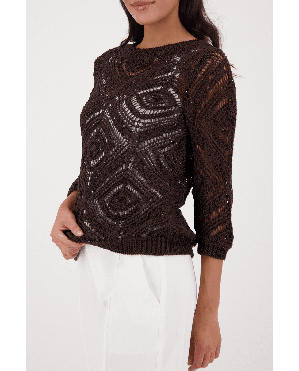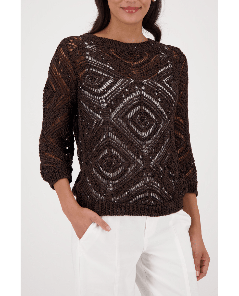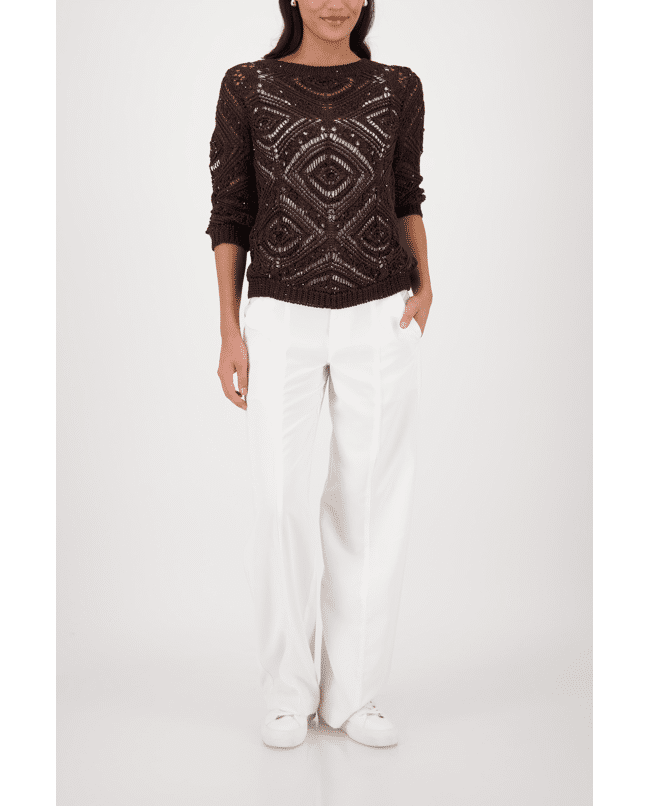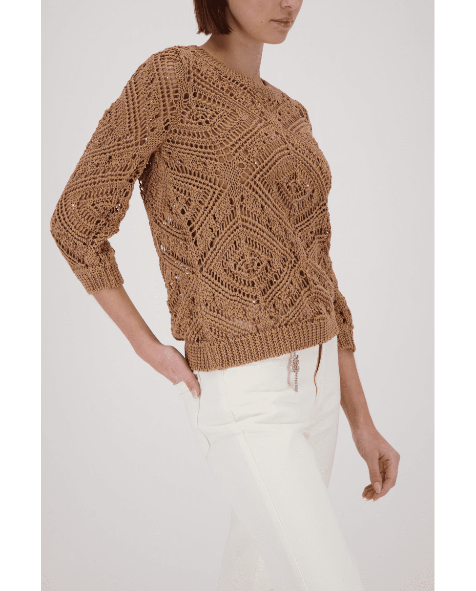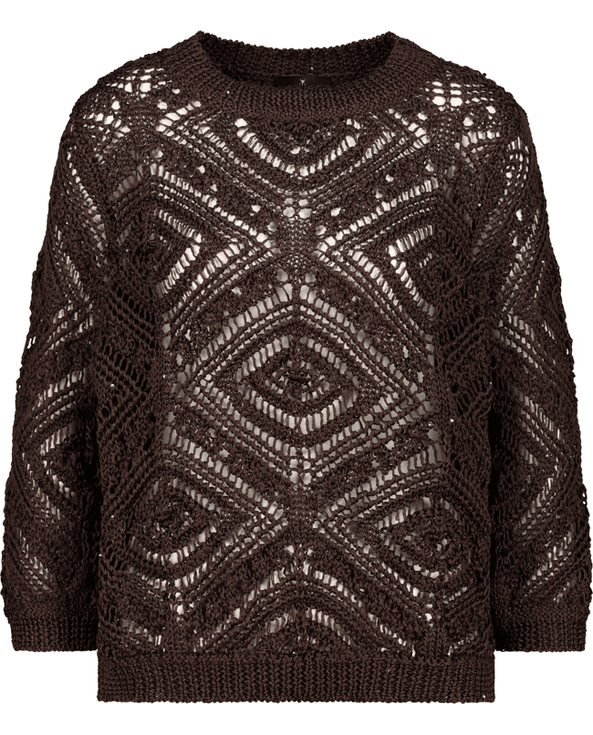 Luchtige ajourtrui met geometrisch patroon. Perfect voor gelaagde lente-looks met een stijlvol accent.