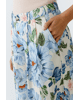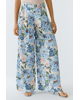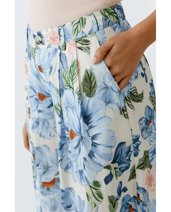 Een luchtige palazzo broek met een frisse bloemenprint in blauw en wit. De wijde pijpen en soepele stof zorgen voor een elegante, zomerse uitstraling.