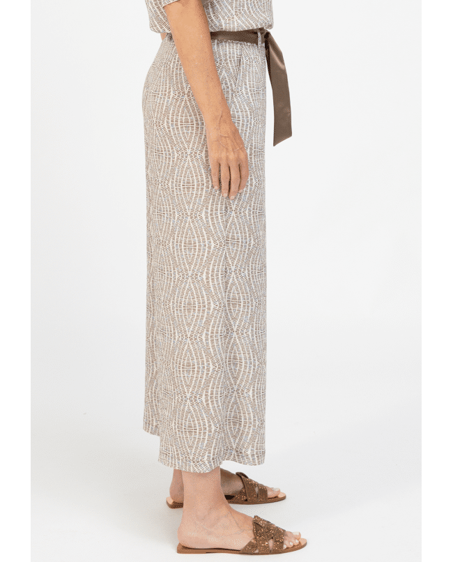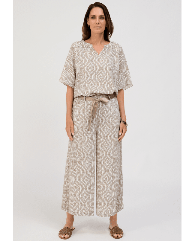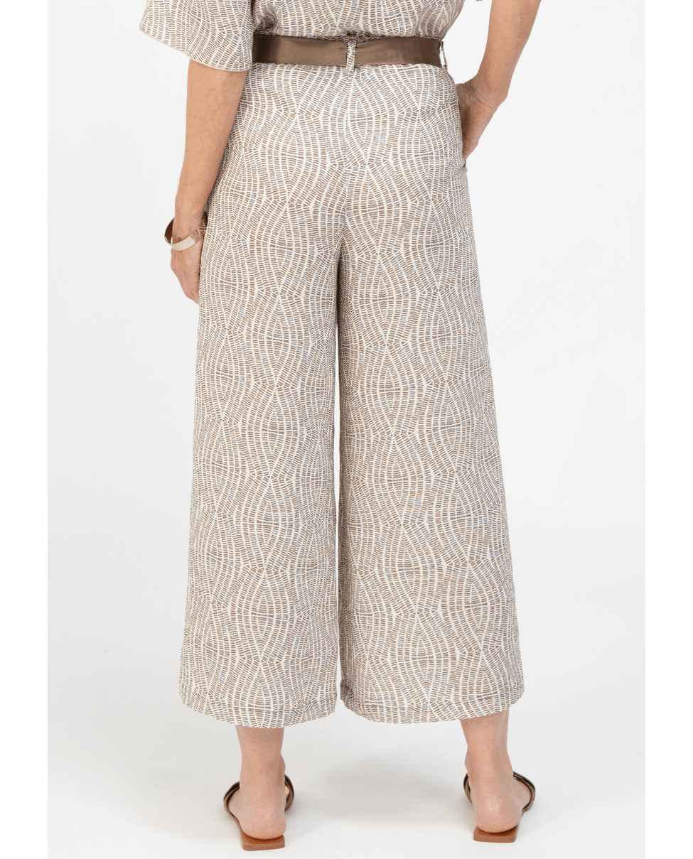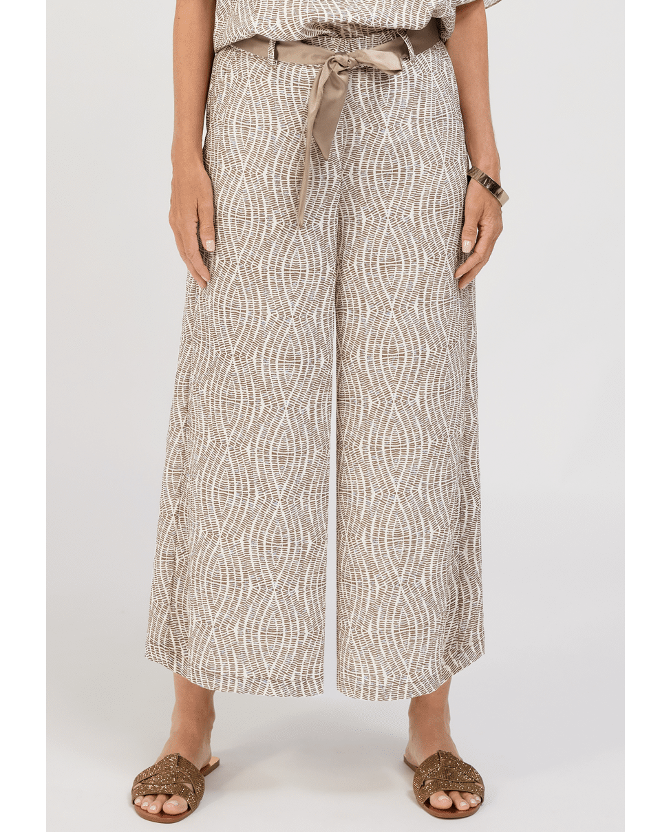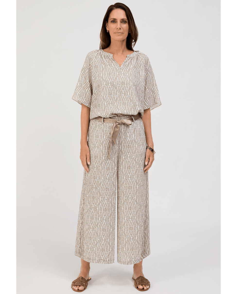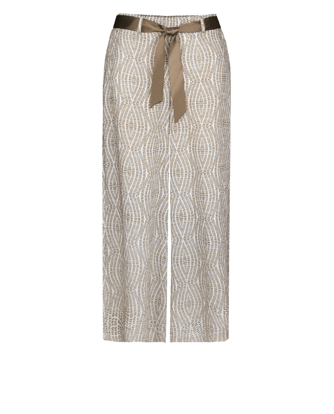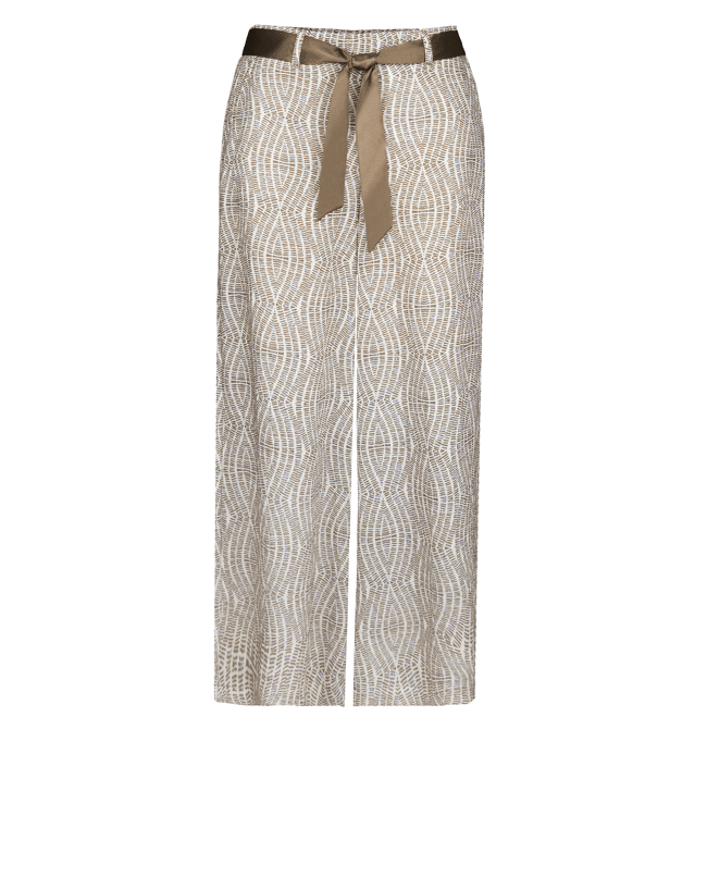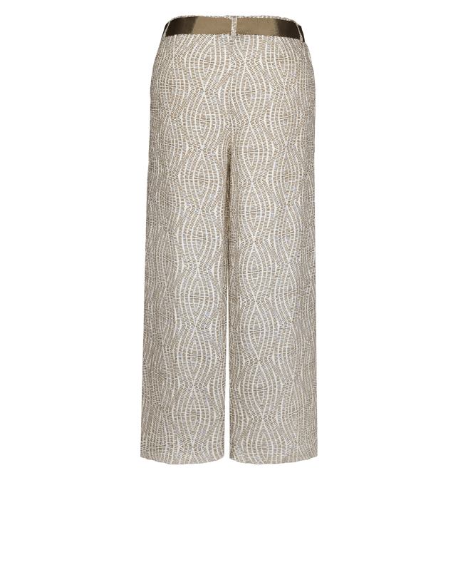 De PARIGI damesbroek van BIANCA is een elegante broek met een verfijnde grafische print in warme bruintinten. De rechte pijpen en het bijpassende striklint in de taille geven een vrouwelijke, moderne uitstraling. Perfect als set met de bijpassende top of als statement piece in je zomergarderobe.