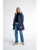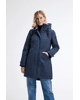 Halflange, functionele damesjas in een diepe donkerdenim kleur. Ideaal voor winterse dagen dankzij de warme imitatiebont voering en beschermende capuchon.