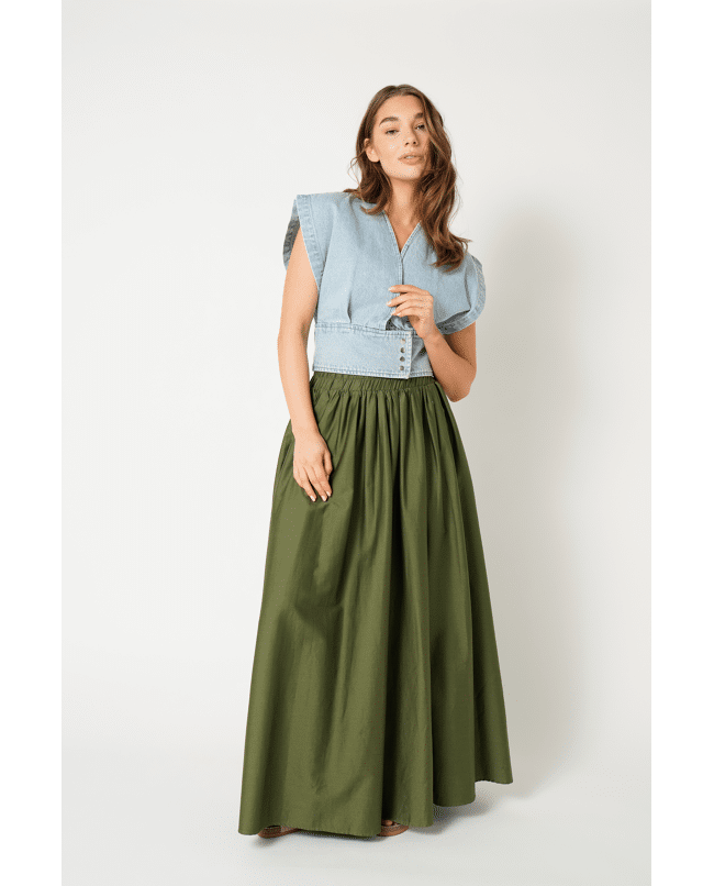 Deze stoere maar vrouwelijke top in licht gewassen denim is een speelse twist op het klassieke jeansitem. De diepe V-hals en gestructureerde schouders geven een krachtig silhouet dat perfect past bij relaxed denim of een high waist pantalon.