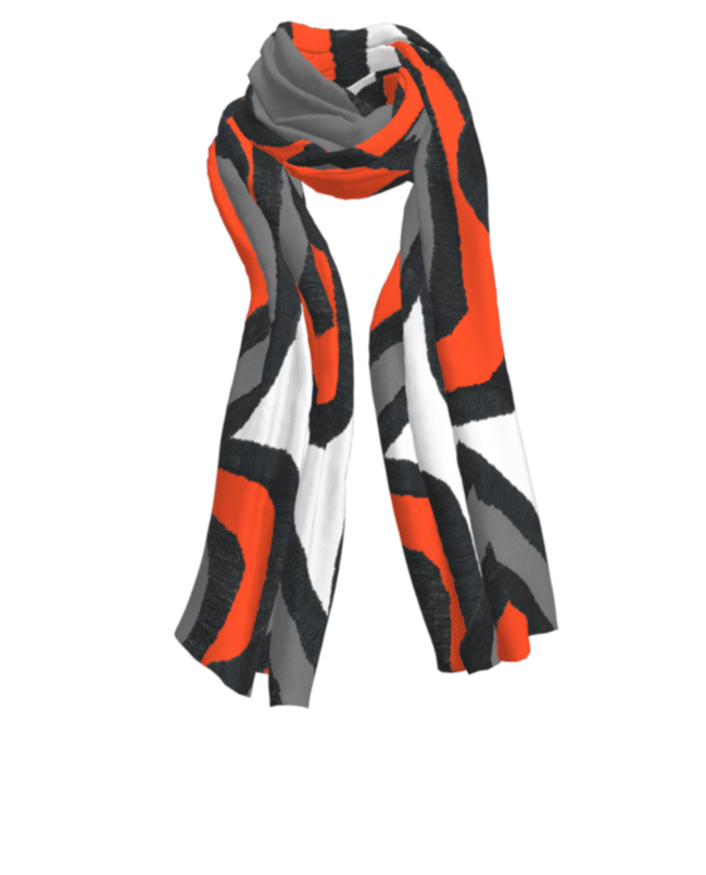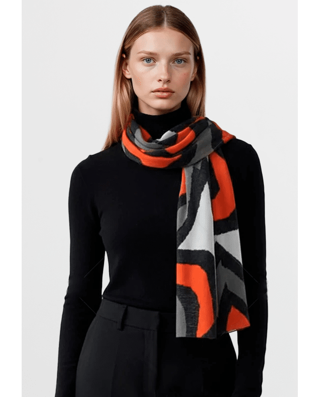 Een statement sjaal die kleur brengt in koude dagen. Met zijn speelse geometrische print in rood, grijs en zwart geeft deze sjaal elke outfit een eigentijdse twist. Perfect voor vrouwen die durven kiezen voor expressieve accessoires.