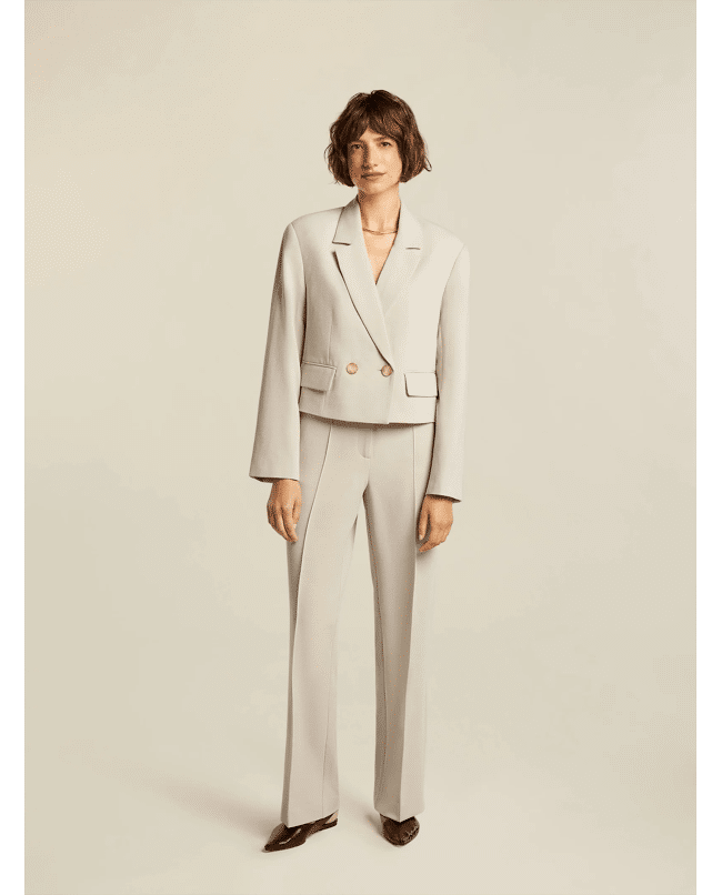 De cropped lengte accentueert de taille.