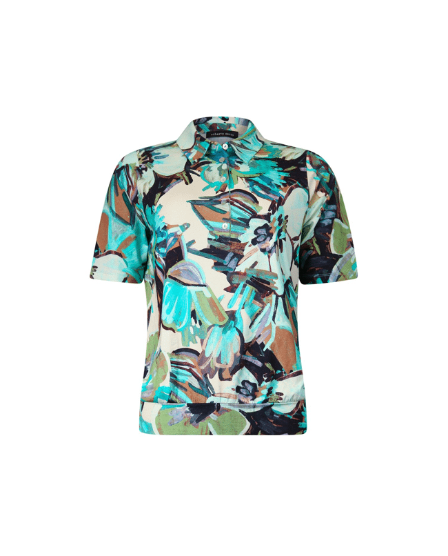 Blouson dames T-shirt met polo kraag van Roberto Sarto in een frisse A.Green-Mint print met geschilderde bloemen. De combinatie van mint, groen en zachte natuurtinten geeft dit item een zomerse, levendige uitstraling. Perfect op een lichte broek of denim voor een comfortabele maar verzorgde look.