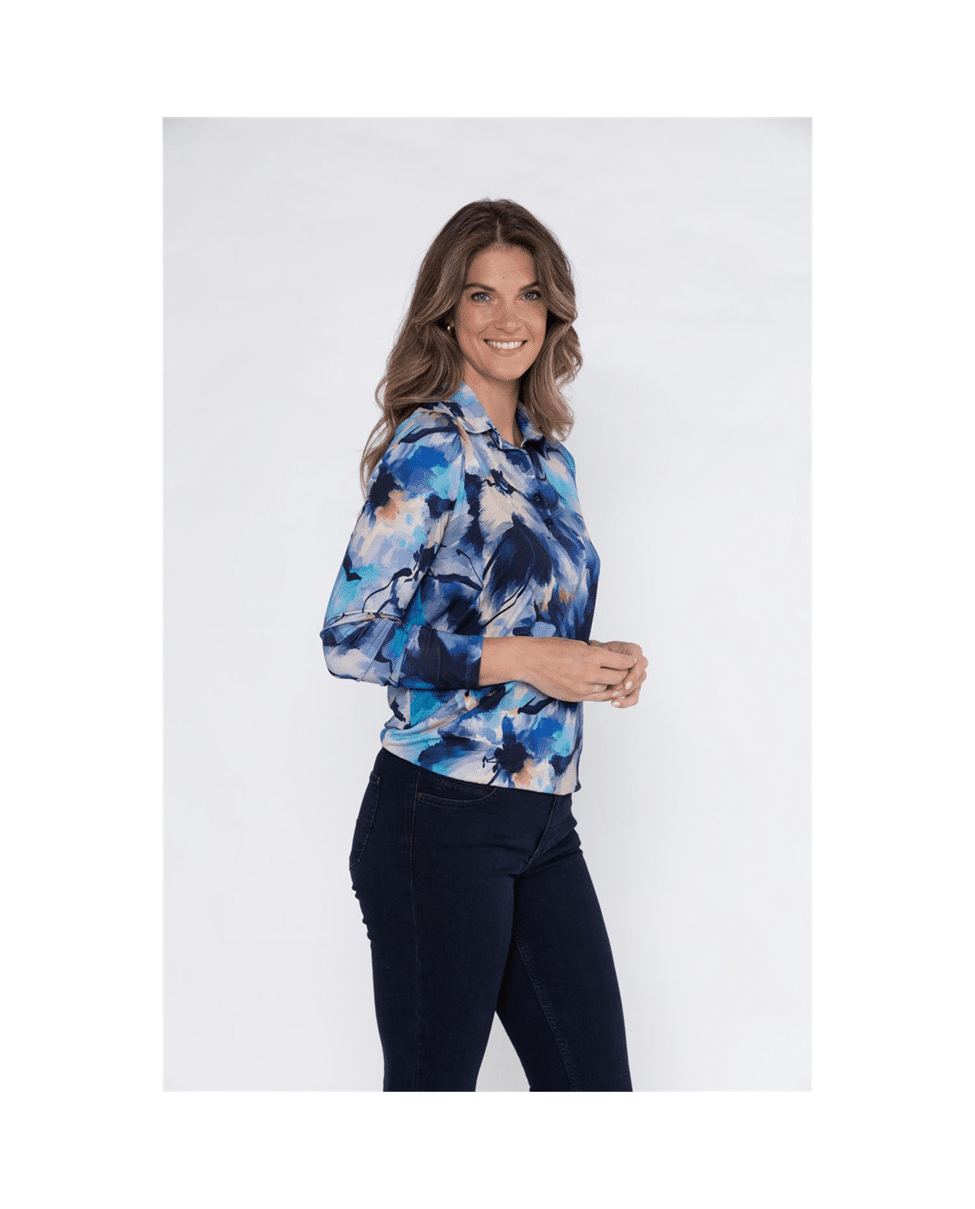 Een blouson T-shirt met polokraag in Dutch blue-navy painted flower print. Het soepele viscose-elasthan jersey en de elastische onderboord zorgen voor een comfortabele fit en vrouwelijke uitstraling.