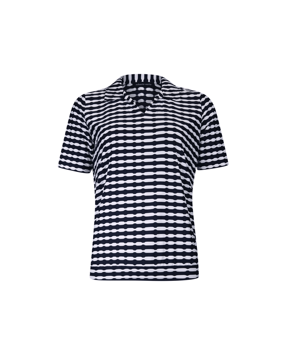 Sportief dames poloshirt in navy-white van Roberto Sarto met een moderne streepprint. De openvallende polo kraag geeft dit T-shirt een frisse, casual uitstraling. Perfect op een jeans of witte broek voor een tijdloze voorjaarslook.