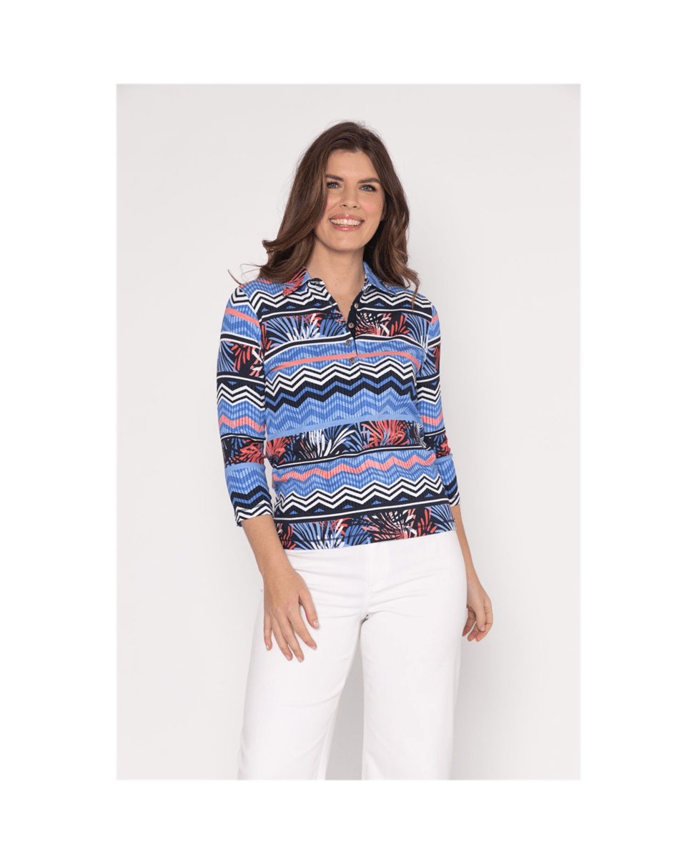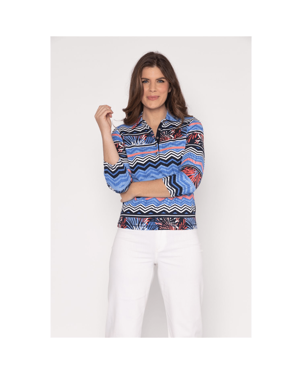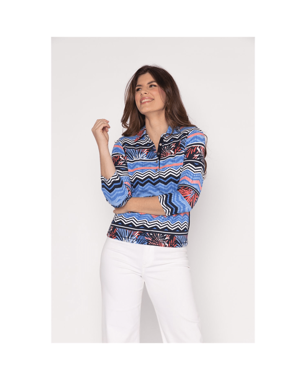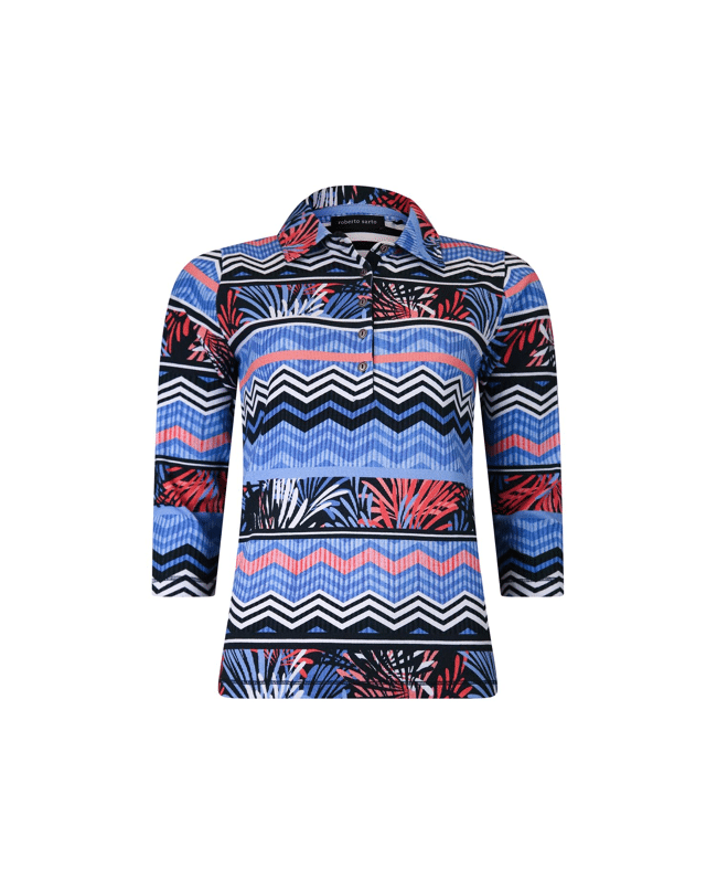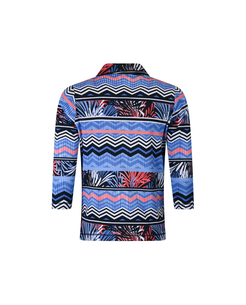 Dit multicolor dames poloshirt met grafische mix print is een echte eyecatcher voor het voorjaar. De combinatie van sky, coral en navy in zigzagstrepen en tropische accenten geeft het shirt een sportieve en moderne uitstraling.